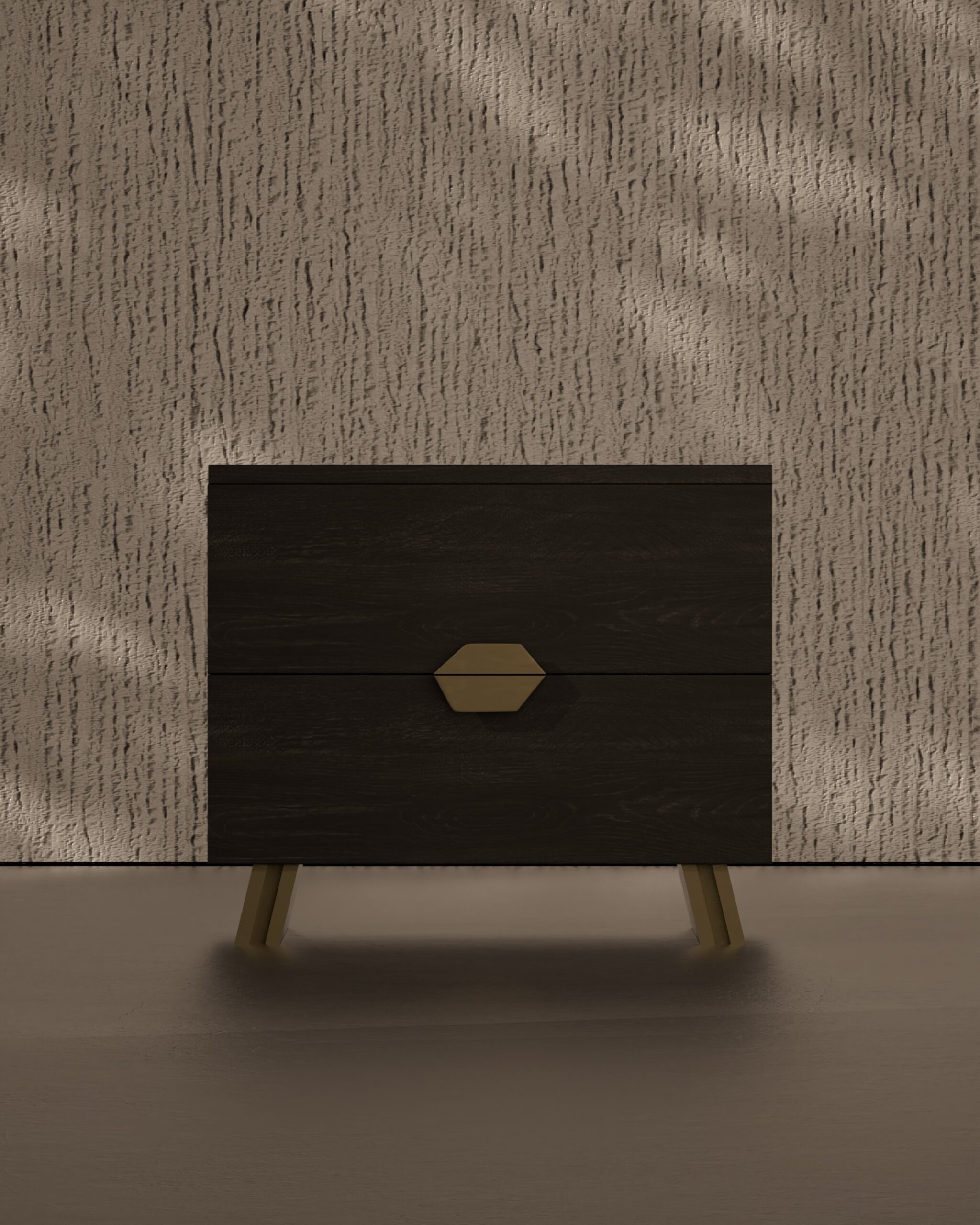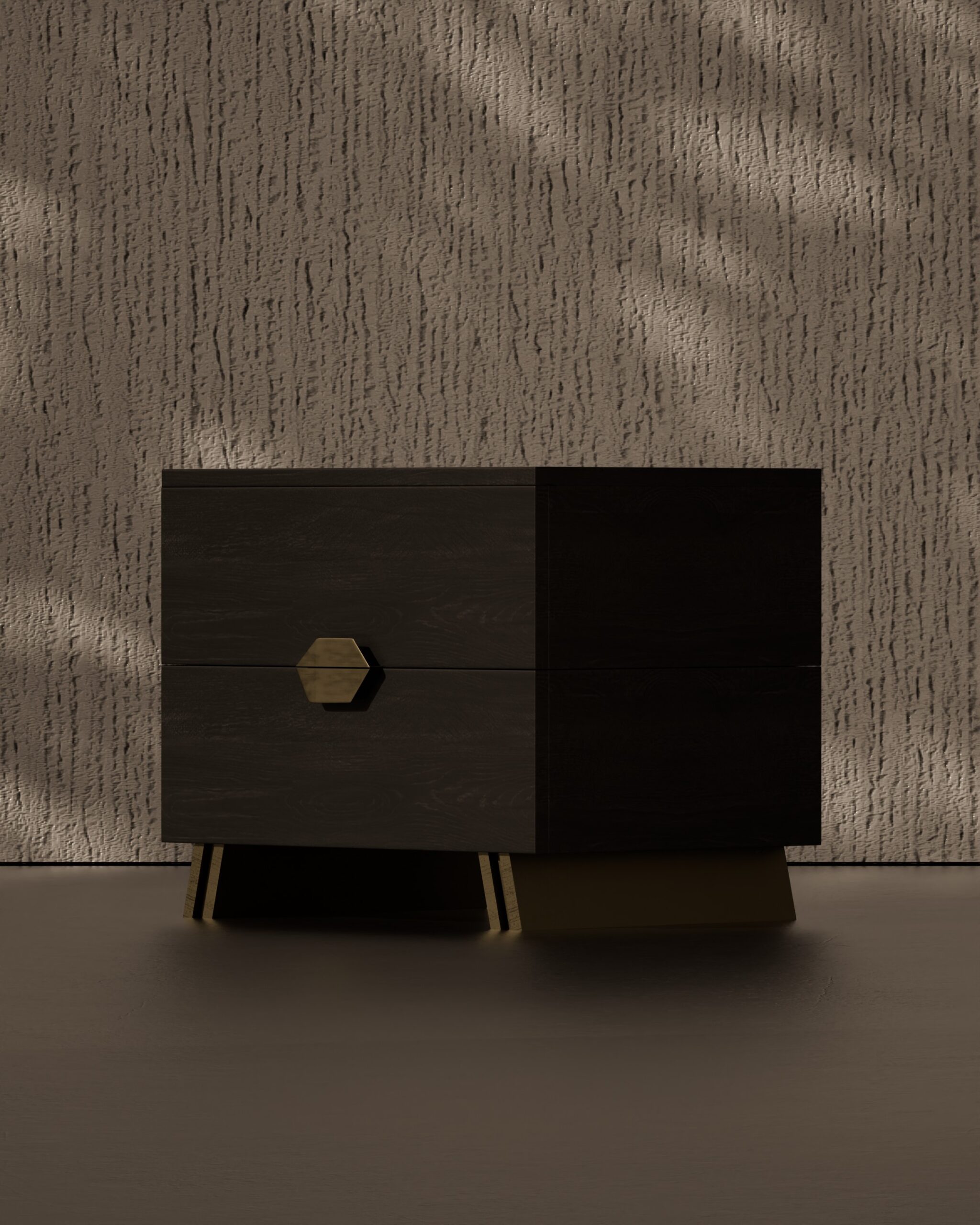 The SABLE bedside table is a fusion of classic heritage materials and bold, modern geometry. Its primary body is meticulously crafted from mappa burl veneer, featuring a distinctive natural grain peppered with contrasting amber and hazel tones. The piece is elevated by American black walnut feet and finished with signature polished brass horn handles, borrowing its sumptuous stature and tactile richness from its namesake.
