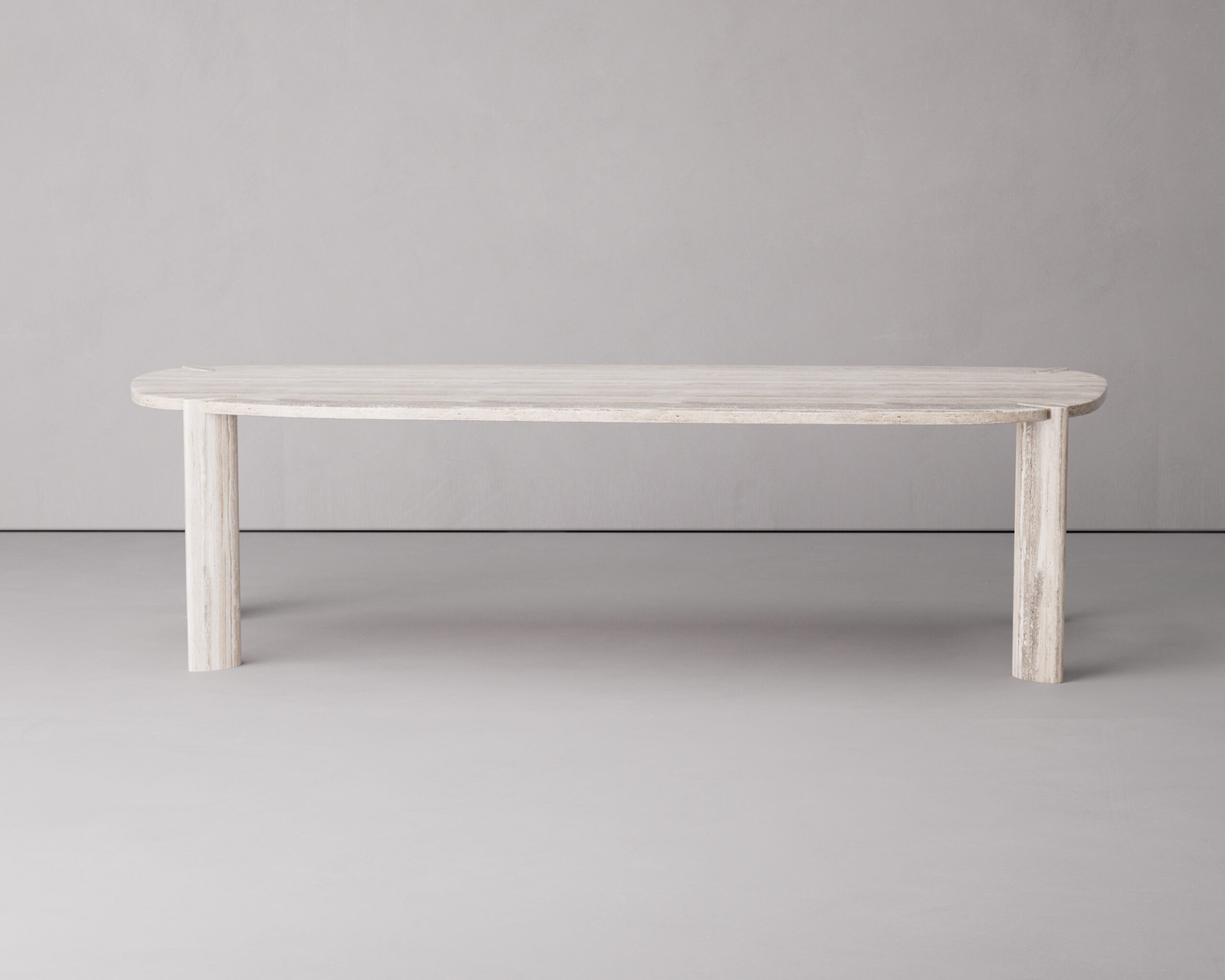 The SATIN dining table is a study in tonal harmony and structural poise. As a signature piece in our Luxury Collection, the design is anchored by an expansive elliptical top crafted from honed travertine, showcasing its characteristic porous texture and soft, cream-toned sedimentary layers.
