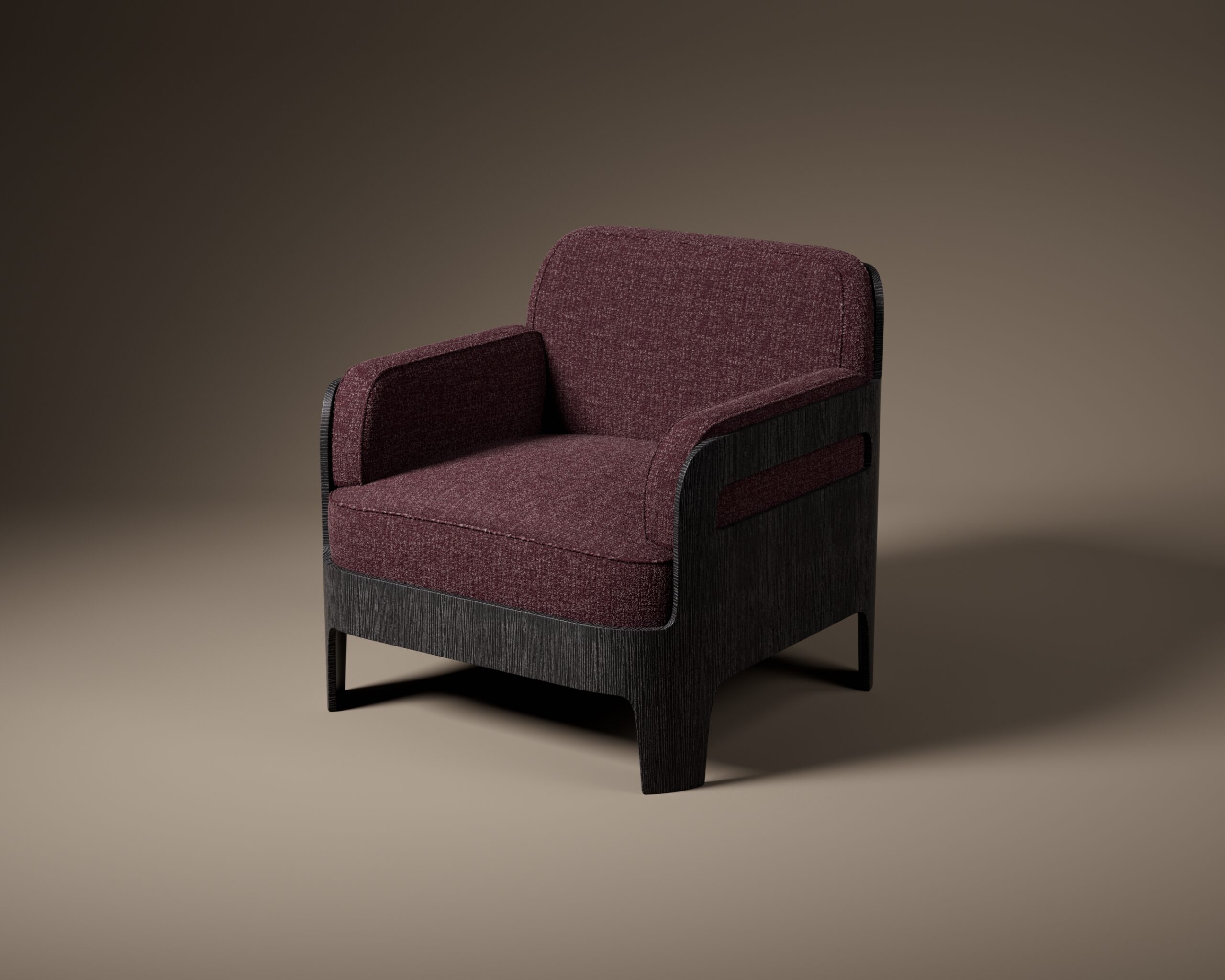 The visual narrative is driven by the contrast between the rigid, dark chassis and the warm, textured interior. The seat and integrated backrest are clad in a deep plum tweed upholstery, providing a rich, tactile landscape that is seamlessly recessed into the wooden shell. Supported by four tapered legs that continue the frame’s vertical grain, the SCRIPT balances its bold material presence with sophisticated artisanal craft. It serves as a commanding and ergonomic focal point for high-end residential libraries and modern executive offices.