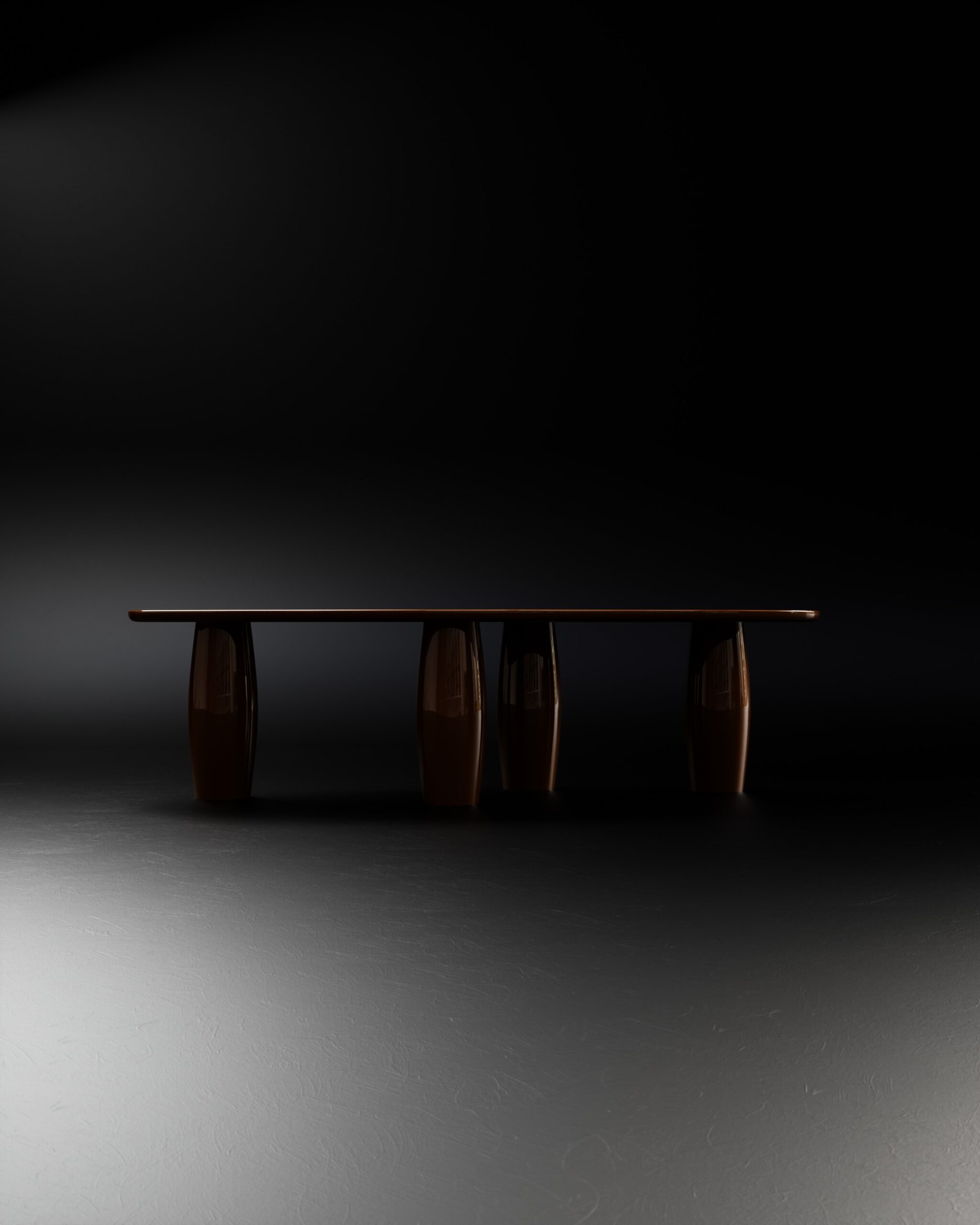 Expansive, fluid “organic-edge” tabletop. Quad-pod structural system with four oversized, tapered “bollard” legs. Seamless, monolithic joinery with a high-reflectivity mirror finish. Softened radius on all vertical and horizontal edges.