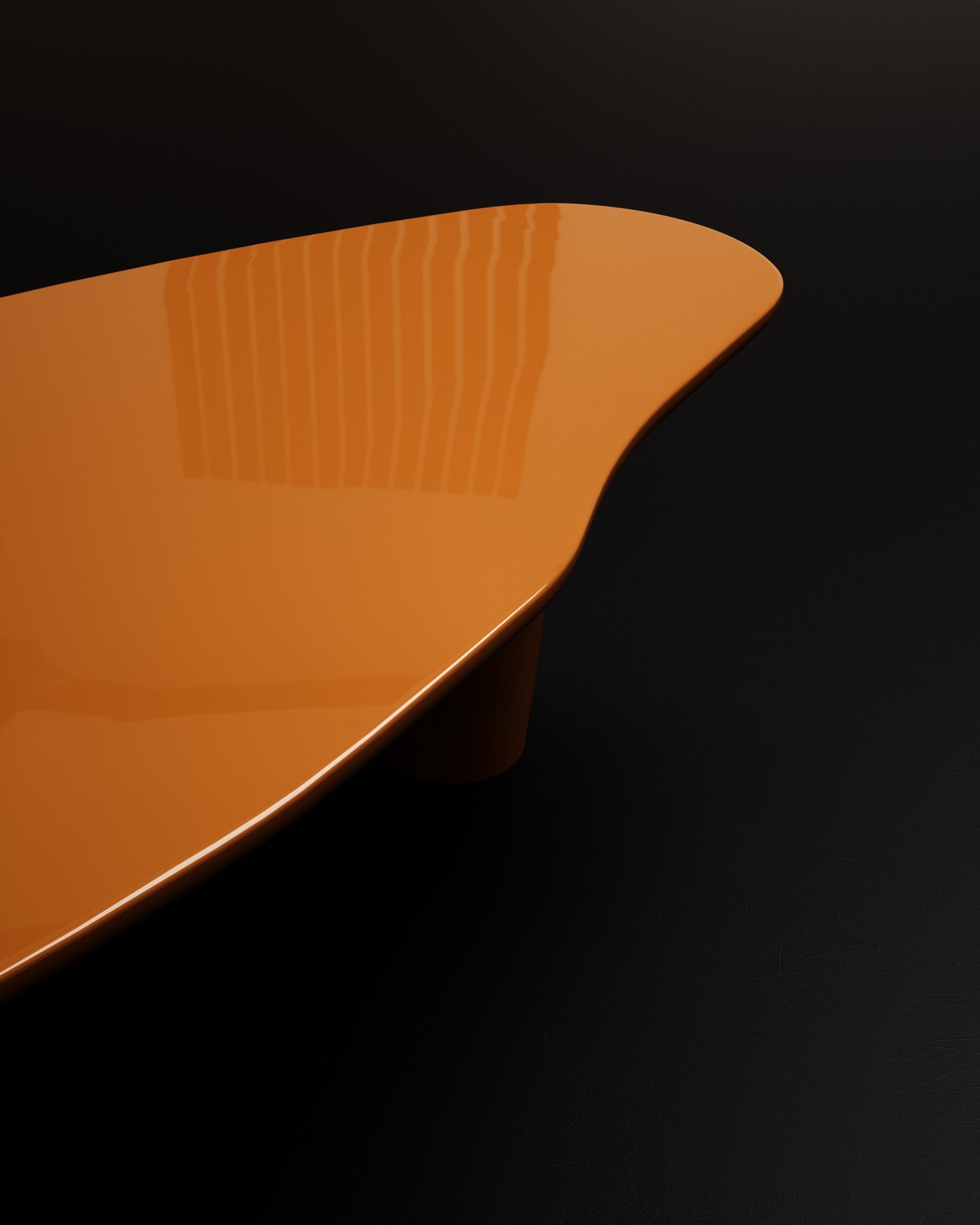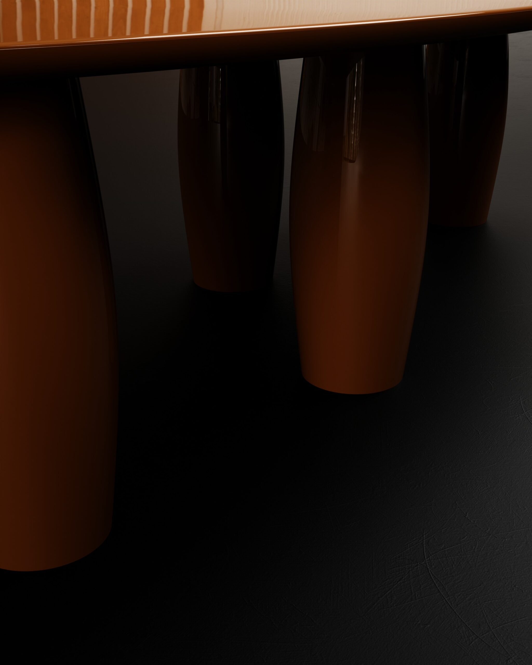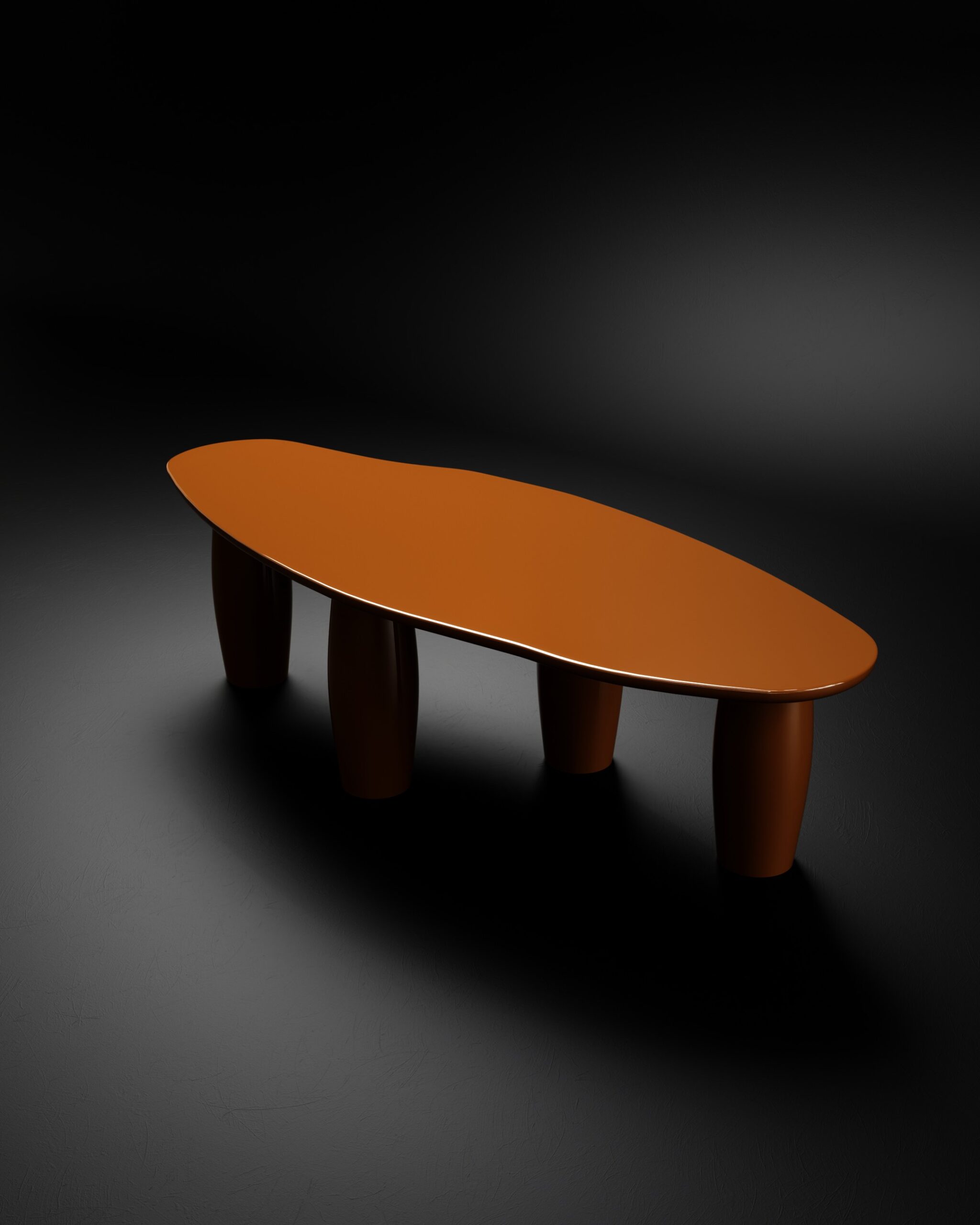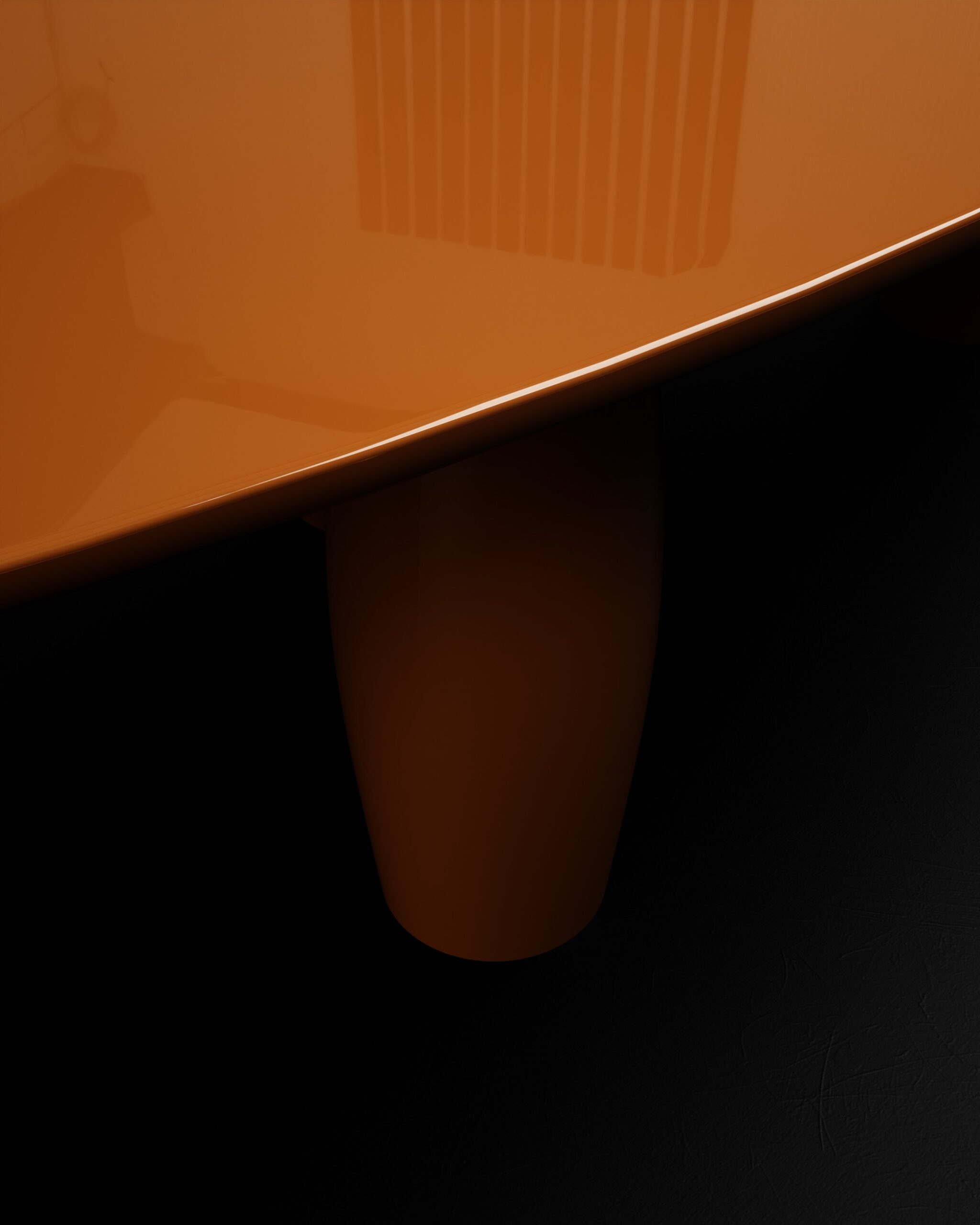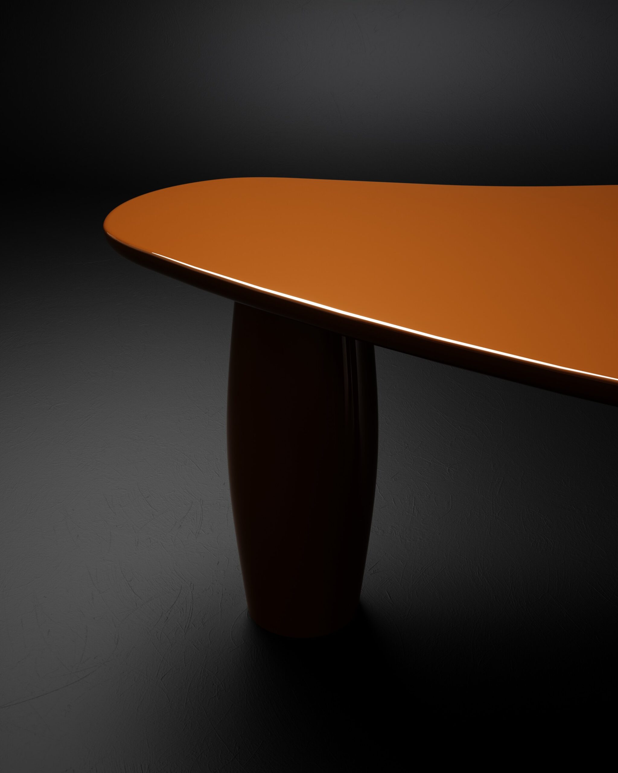 The SEDONA dining table is a bold exploration of fluidity and structural permanence. Part of our Design Studio Collection, it features a sweeping, irregular tabletop that mimics the natural erosion of desert landscapes. The entire piece is finished in a high-gloss amber lacquer, creating a liquid-like surface that reflects light across its soft, generous curves. Supported by four substantial, sculptural pillar legs, the SEDONA balances a playful, avant-garde silhouette with a grounded, monolithic presence, serving as a functional piece of art for the modern dining space.