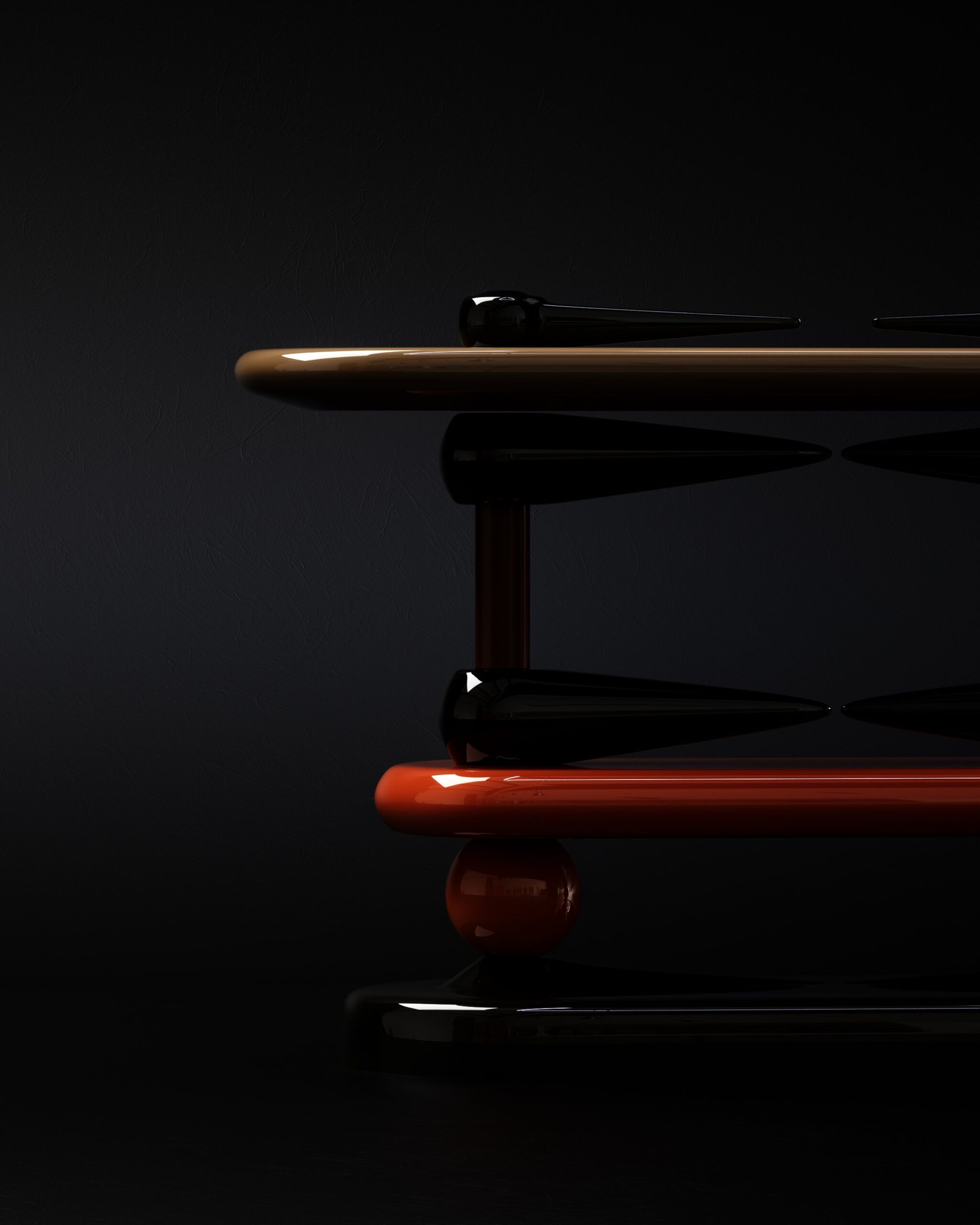 The SIENNASTRIDE console is a study in dynamic equilibrium and retro-futuristic silhouette. Part of our Design Studio Collection, the piece is characterized by its high-gloss, triple-tier composition that transitions from a deep obsidian base to an ochre central shelf, culminating in an expansive tan top surface. The architectural narrative is defined by tapered, black spindle-like elements that appear to pierce through the horizontal planes, providing structural support while emphasizing a sense of forward motion. Supported by two vibrant ochre spheres that ground the central tier, the SIENNASTRIDE balances bold color blocking with a sleek, aerodynamic profile, making it a striking sculptural anchor for galleries and modern entryways.