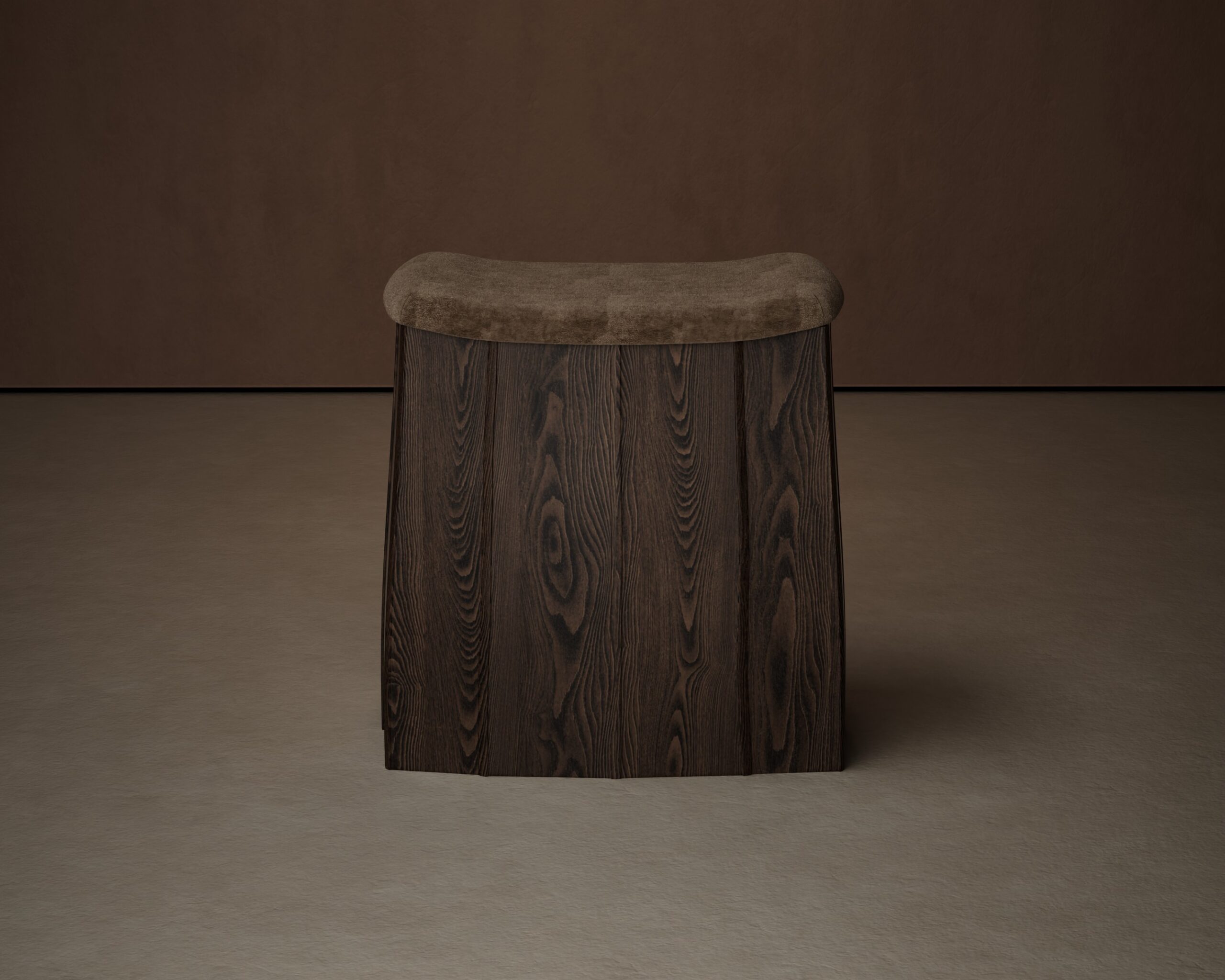 The SLOPE pouf is an exploration of rhythmic verticality and ergonomic contouring. Part of our Design Studio Collection, the piece is anchored by a substantial, tapering base constructed from vertical planks of solid deep walnut, showcasing a rich, linear grain. The architectural rigidity of the wooden “palings” is softened by a recessed, saddle-shaped seat upholstered in a plush earth-toned umber velvet. Defined by its fluid top-line and grounded presence, the SLOPE balances the heavy, structural language of timber with a refined tactile surface, offering a sophisticated seating option that doubles as a sculptural statement.