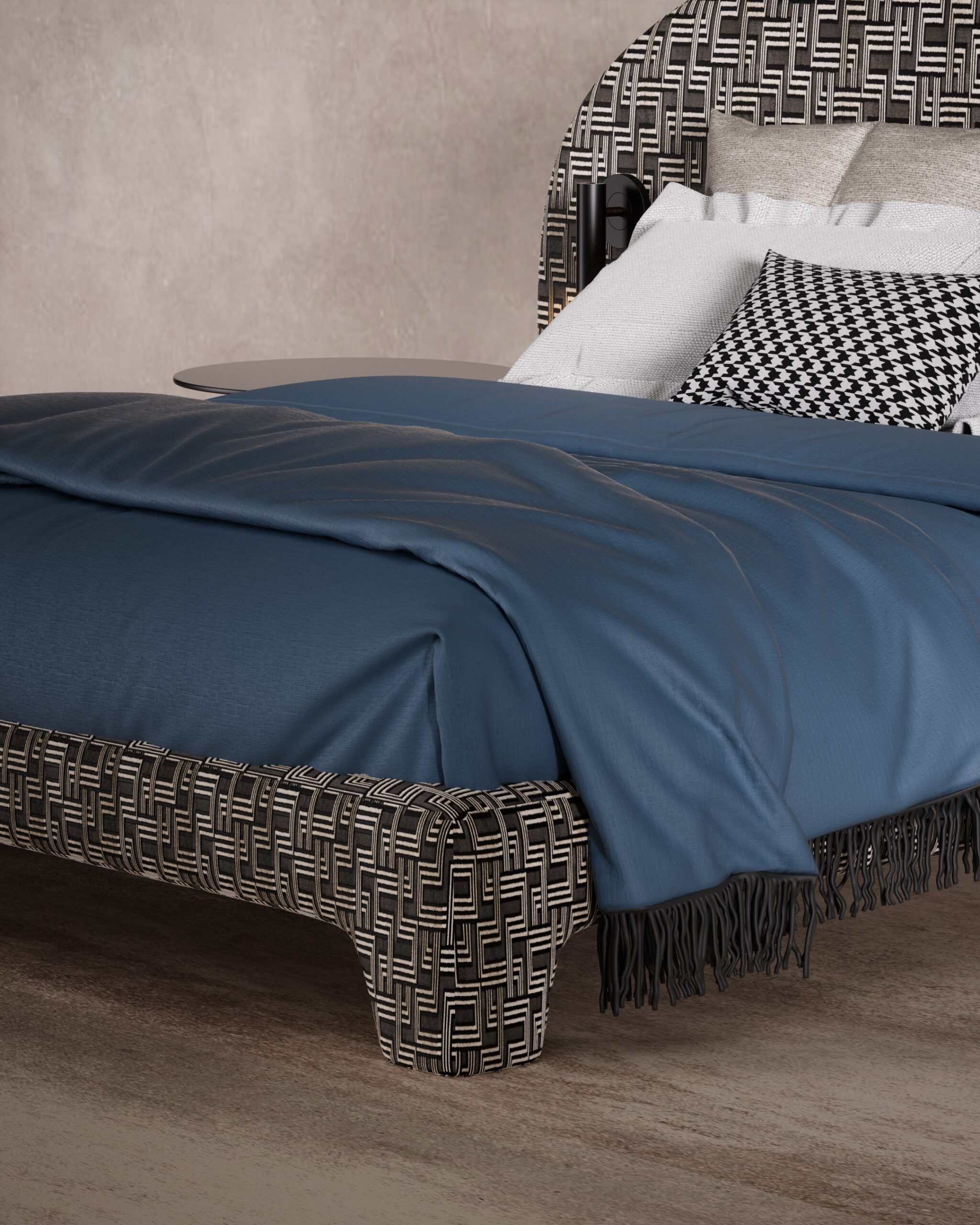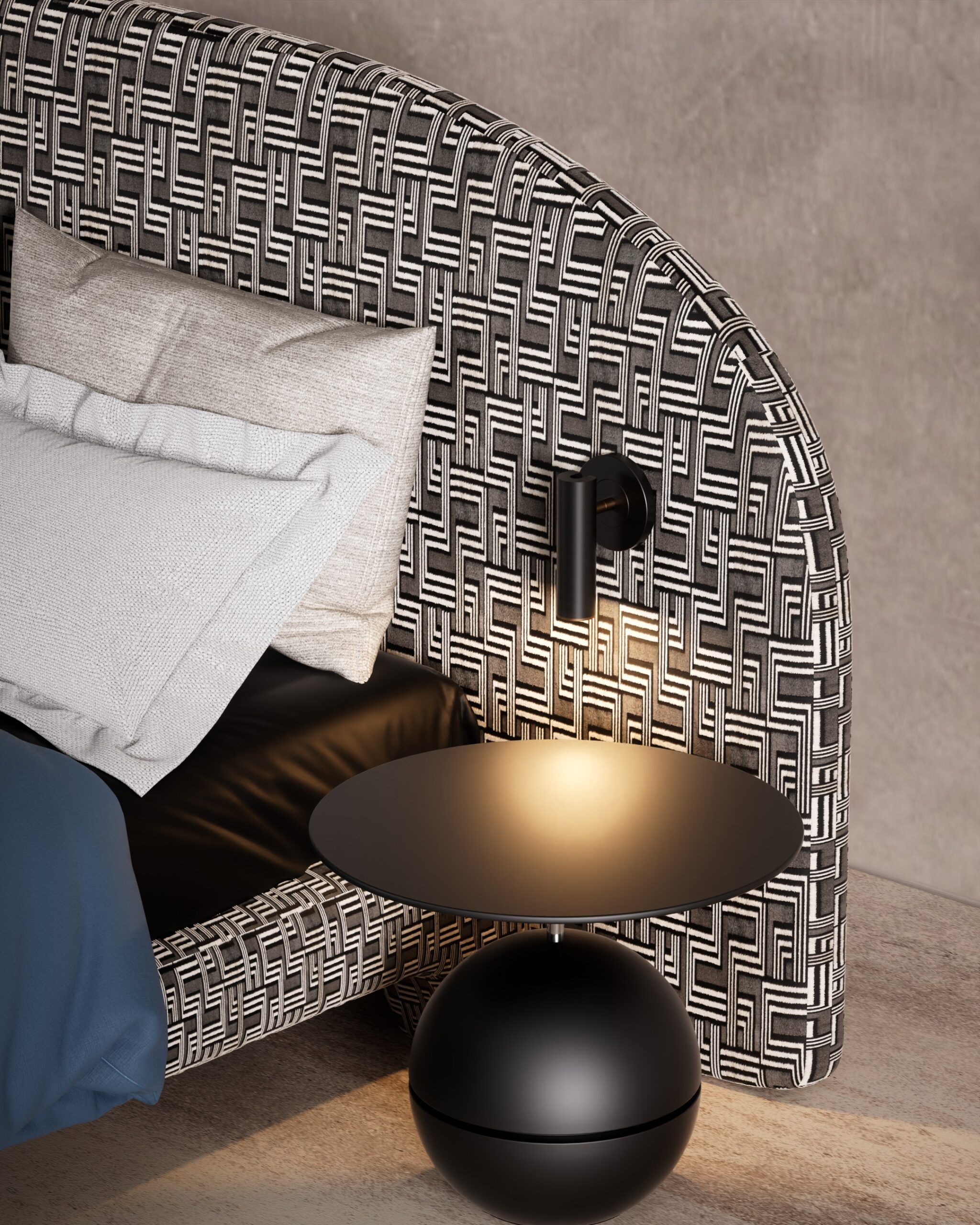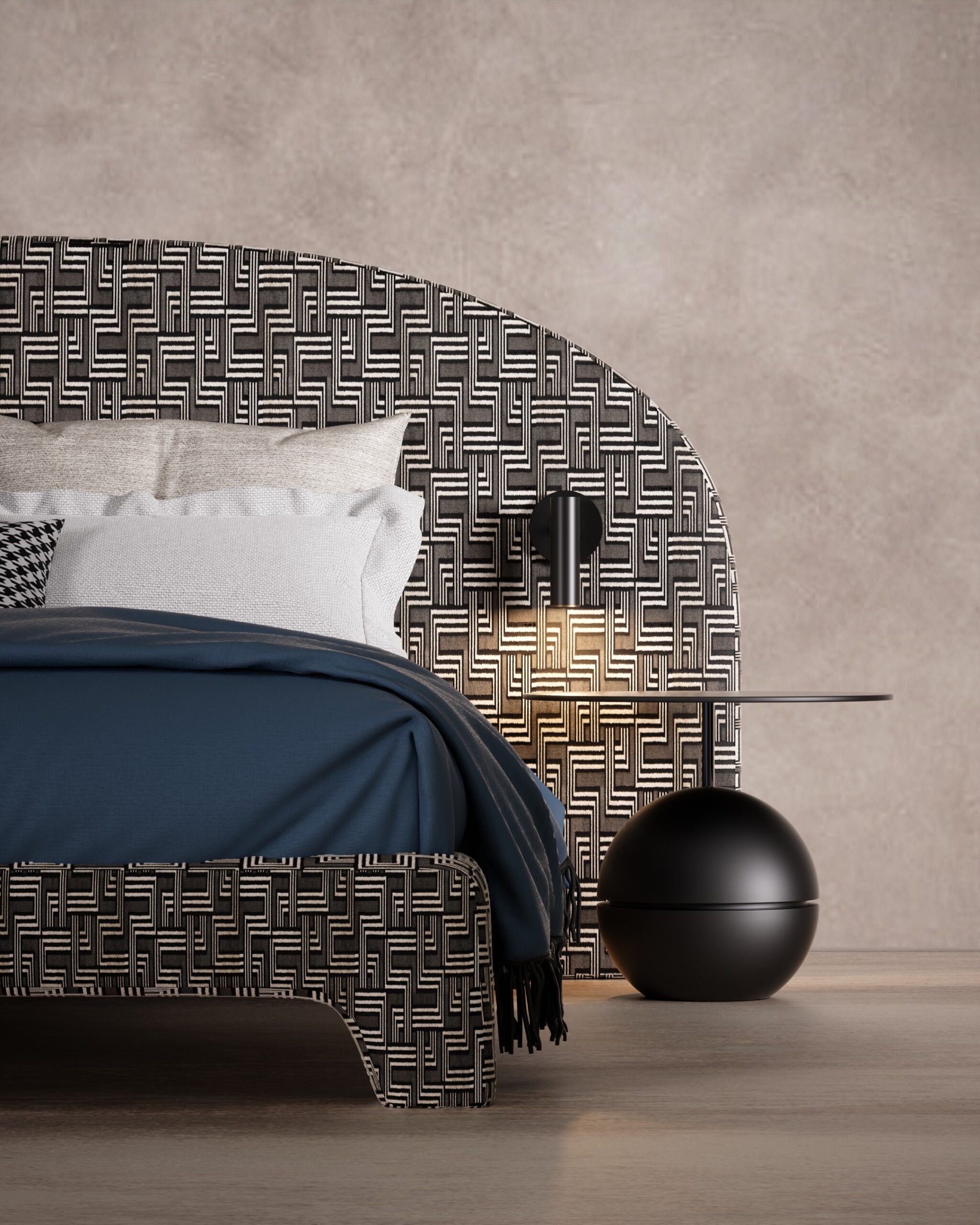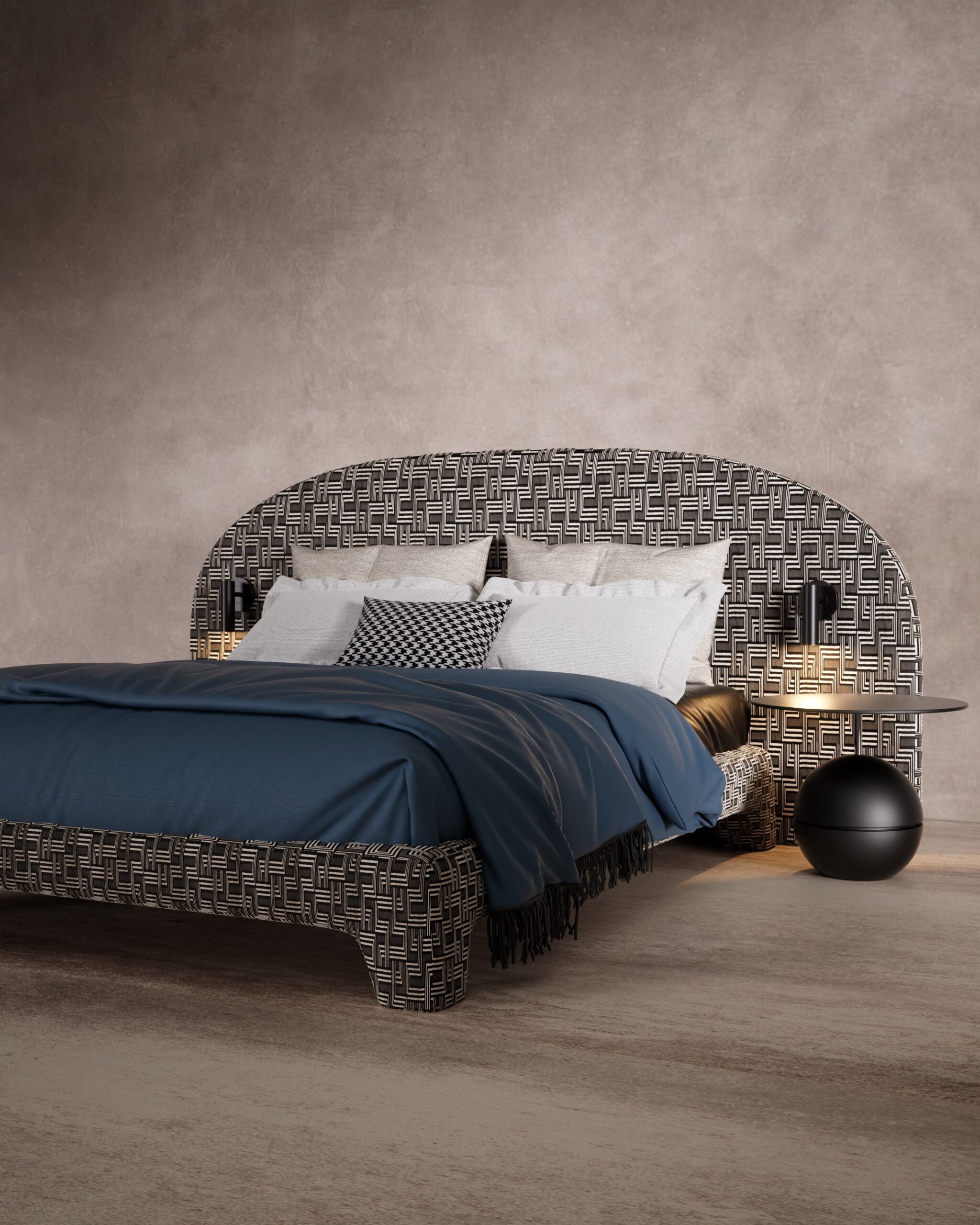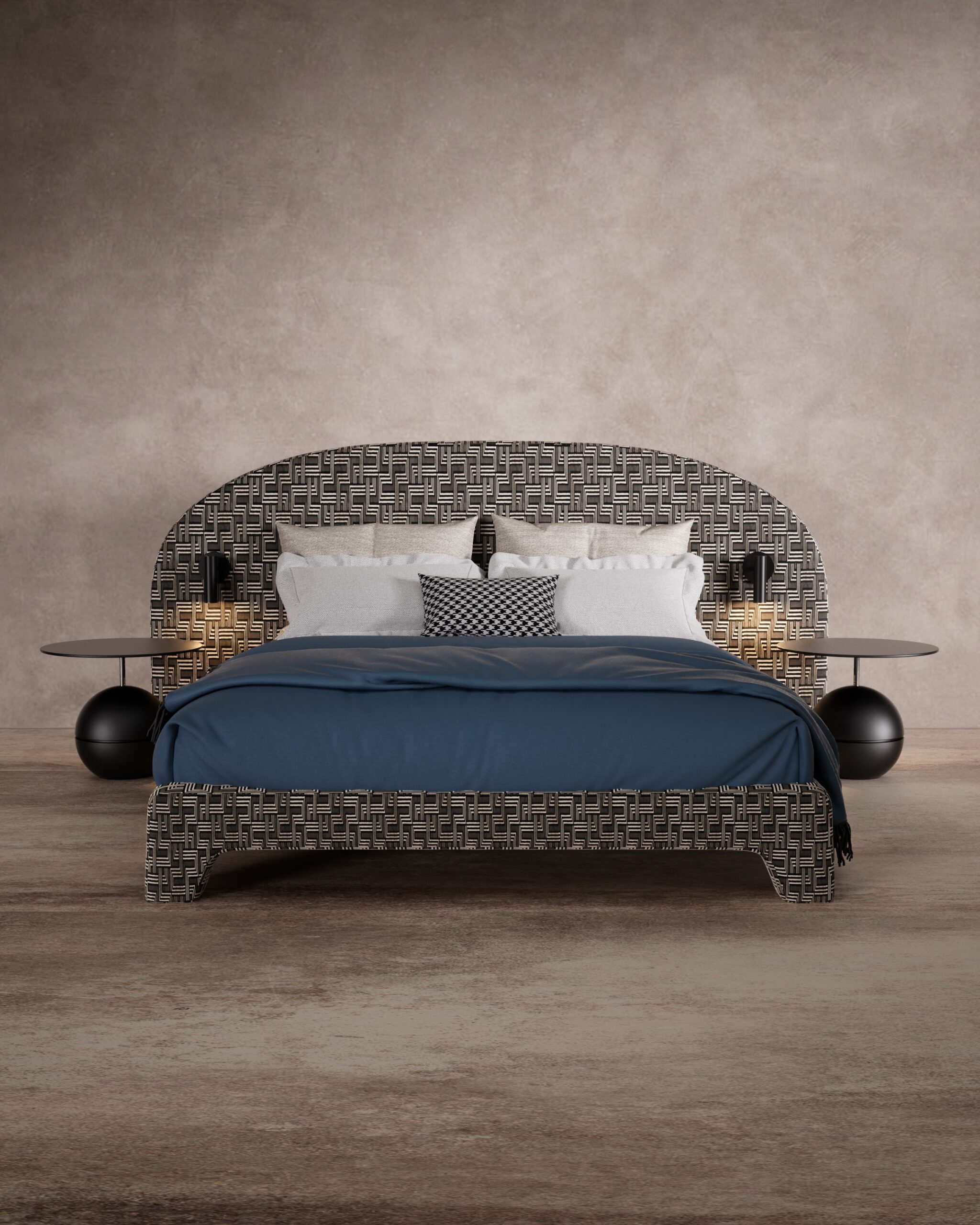 The STRETTO bed is a bold exercise in graphic maximalism and optical rhythm. The design is dominated by an expansive, arched headboard upholstered in a hypnotic black-and-white geometric maze pattern, which extends seamlessly down to wrap the frame and legs for a unified, monolithic look. This intricate visual texture is balanced by sleek, integrated matte black reading lights and avant-garde spherical side tables, while a deep navy duvet adds a block of solid color to ground the vibrant energy.