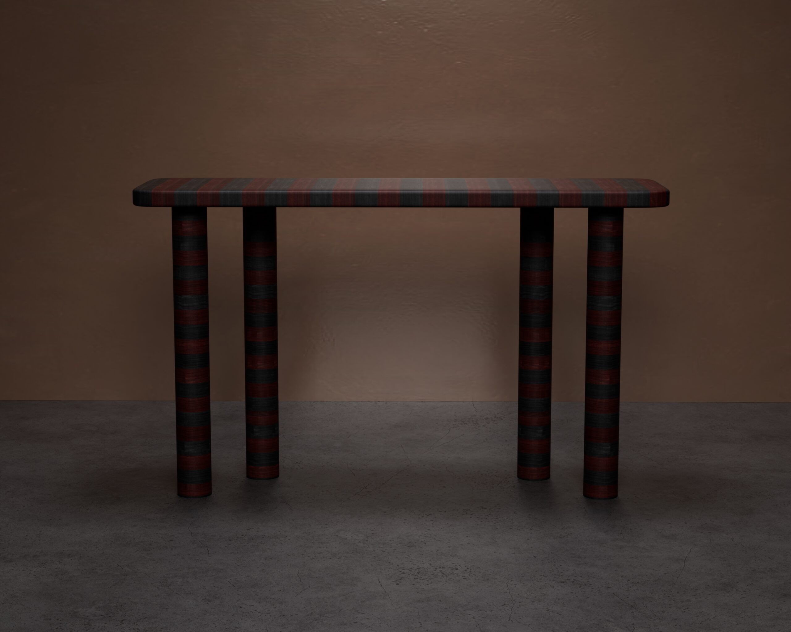 The STRIA console is a study in linear rhythm and optical continuity. Part of our Design Studio Collection, the piece is defined by a bold, repeating pattern of alternating horizontal bands. Crafted from solid deep walnut and high-contrast matte black composite, the graphic stripes wrap seamlessly around four cylindrical pedestals and continue across the length of the expansive, rounded-edge top. This rhythmic application of material masks the joinery, creating the illusion of a single, vibrating volume. The STRIA balances the natural warmth of timber with a rigorous geometric logic, offering a sophisticated and dynamic anchor for contemporary corridors and living spaces.