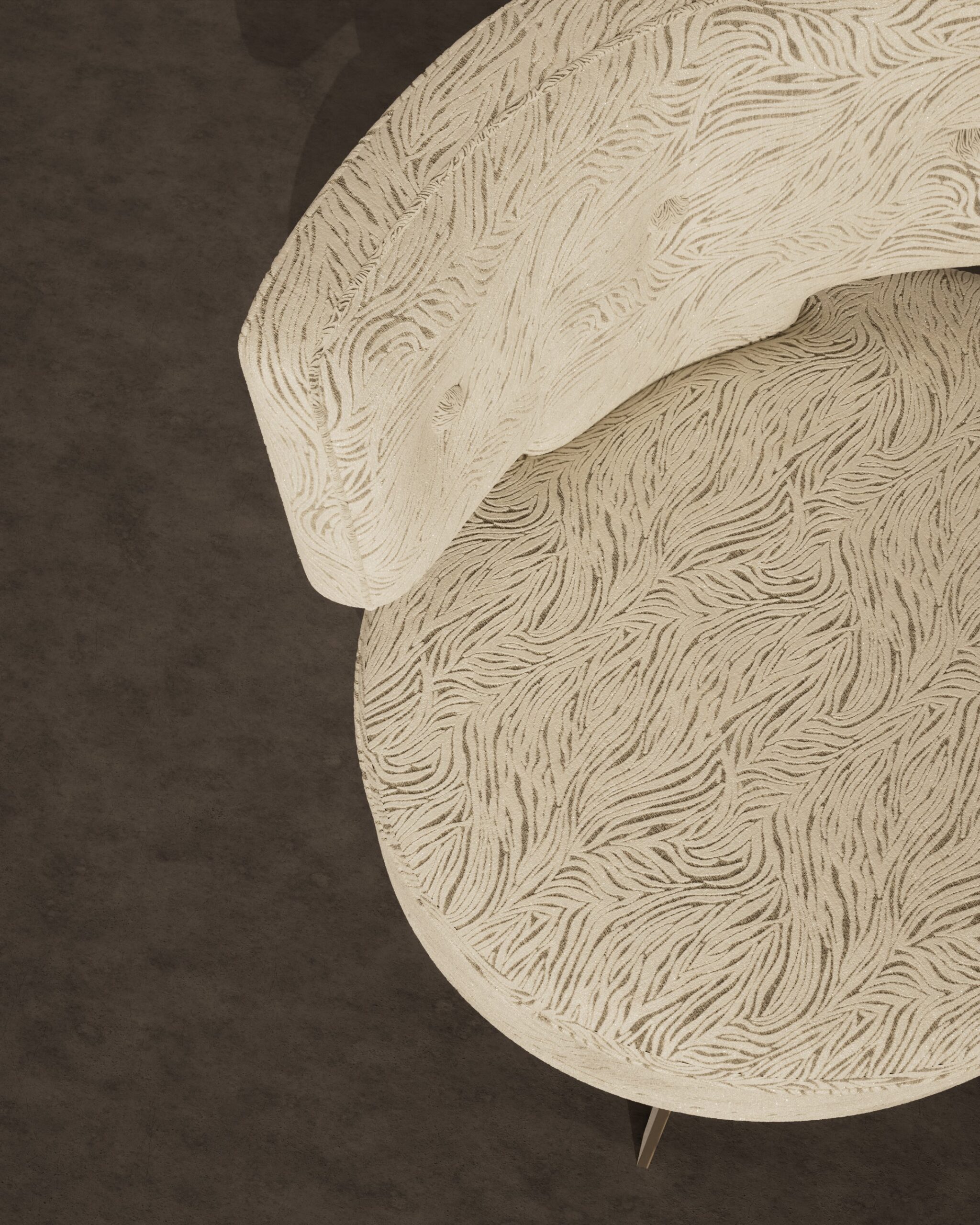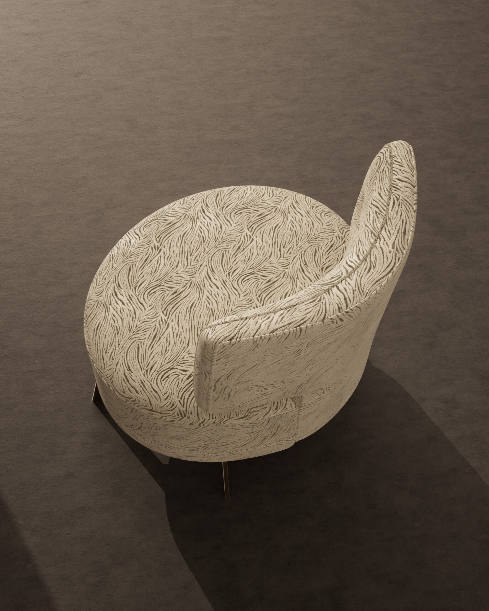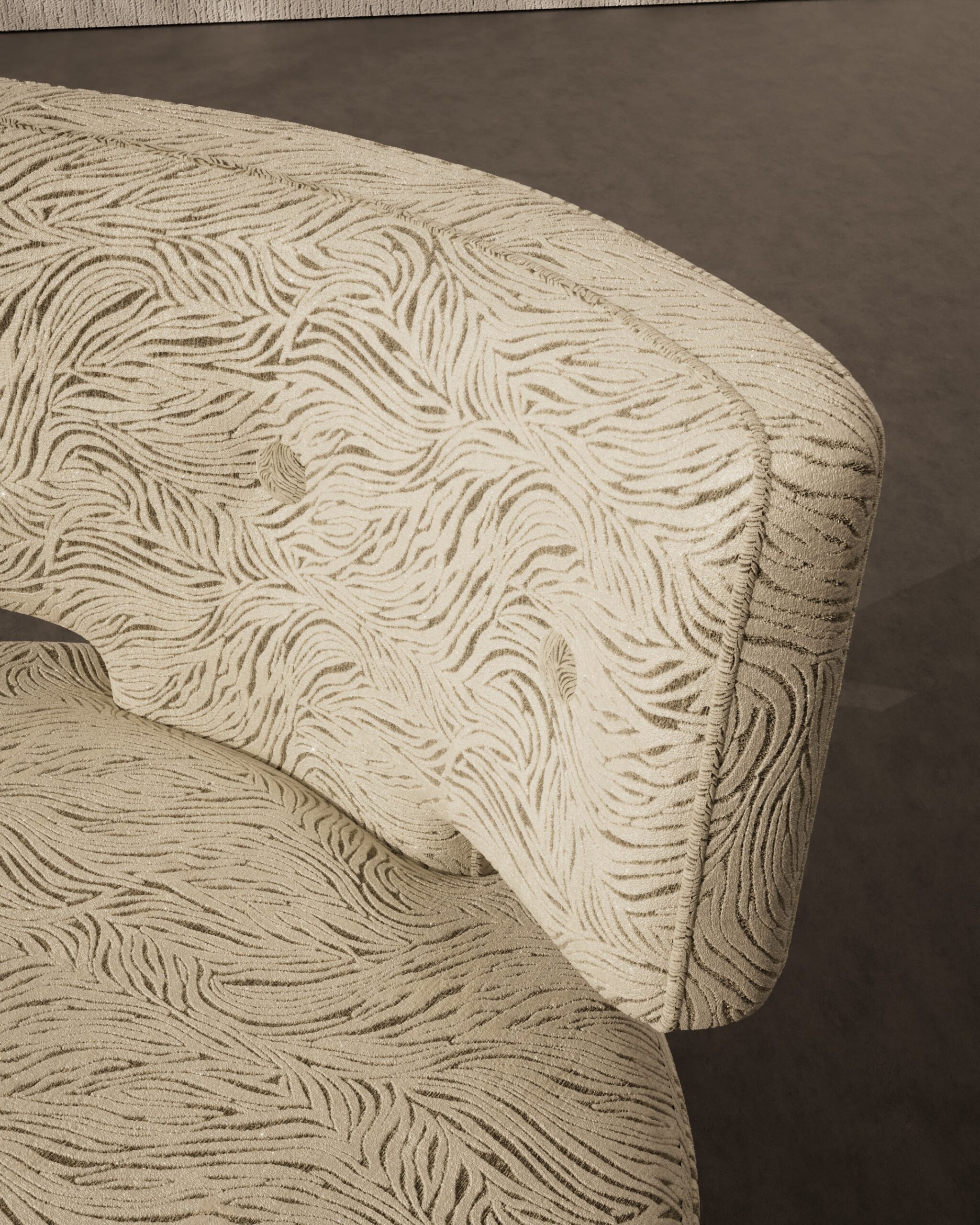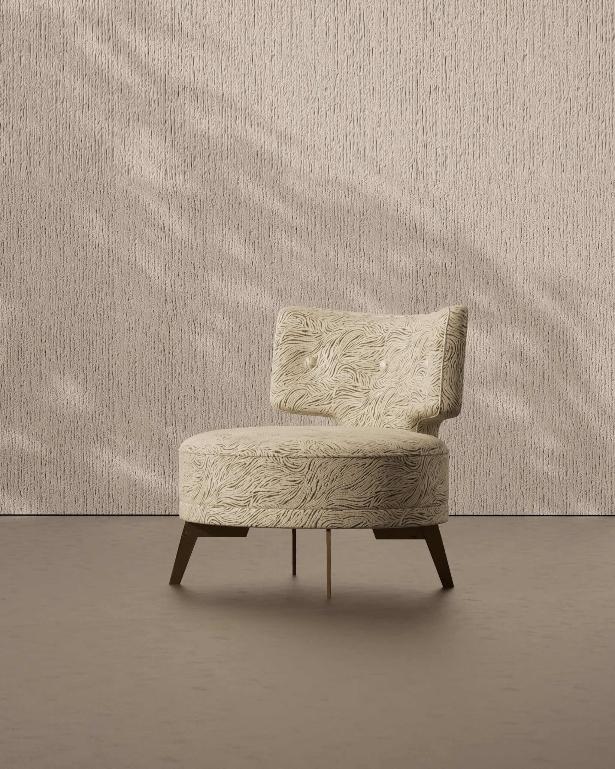 The SURI armchair is a chic reimagining of the classic slipper chair, defined by its mesmerizing textile and petite, poised stature. The design features a perfectly circular seat paired with a gently curved, button-tufted backrest, both enveloped in a luxurious cream fabric. This upholstery boasts a hypnotic, high-relief pattern of undulating waves—evoking abstract animal prints or wind-blown sand—that catches the light to create depth and movement. Perched atop razor-thin, tapered bronze legs, the Suri feels light and airy, making it an exquisite accent piece for a dressing room or a sophisticated conversation cluster.