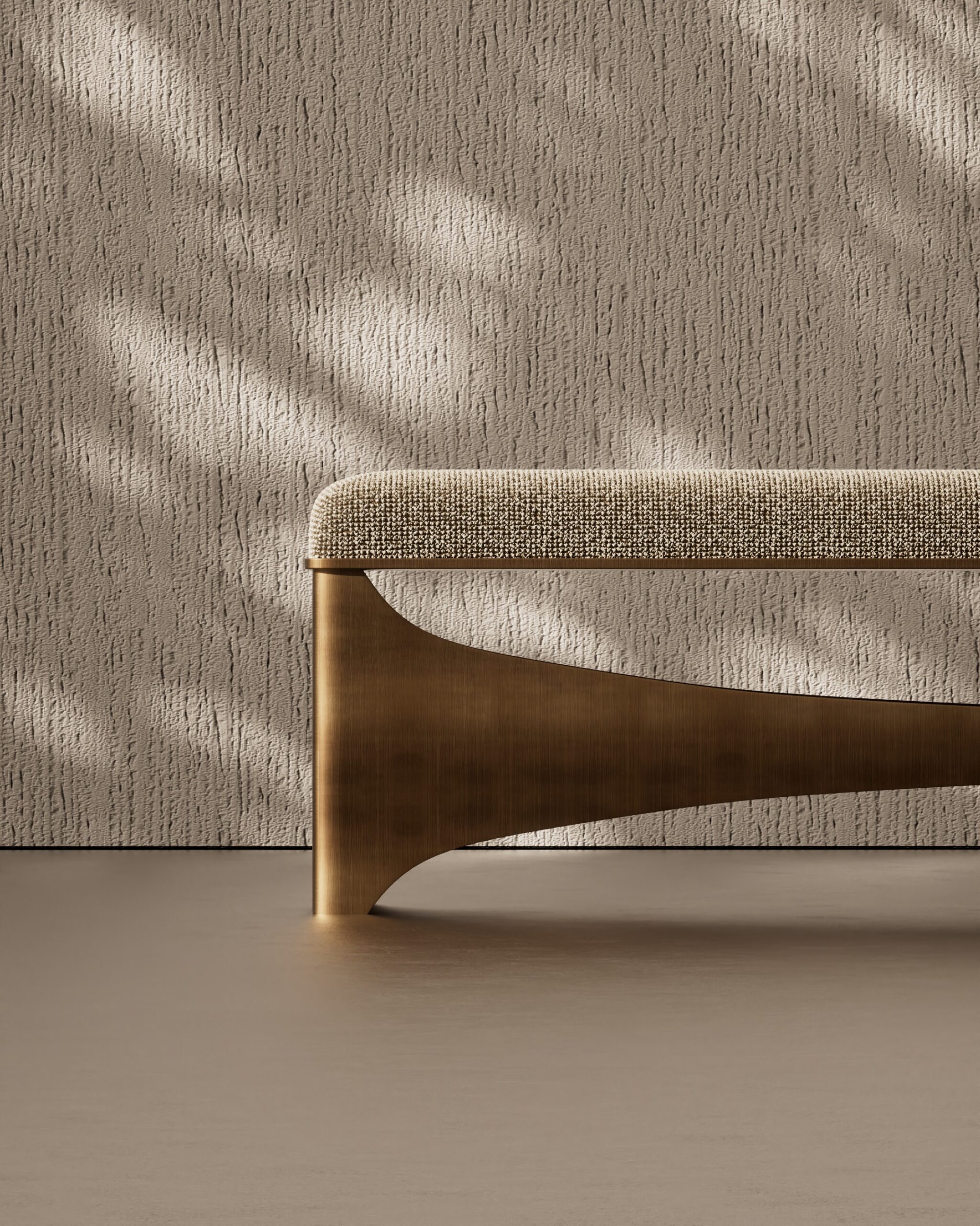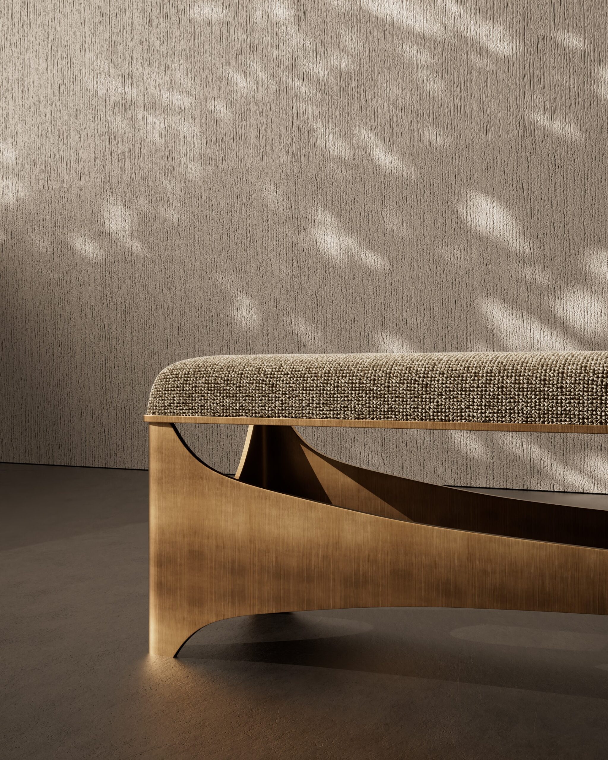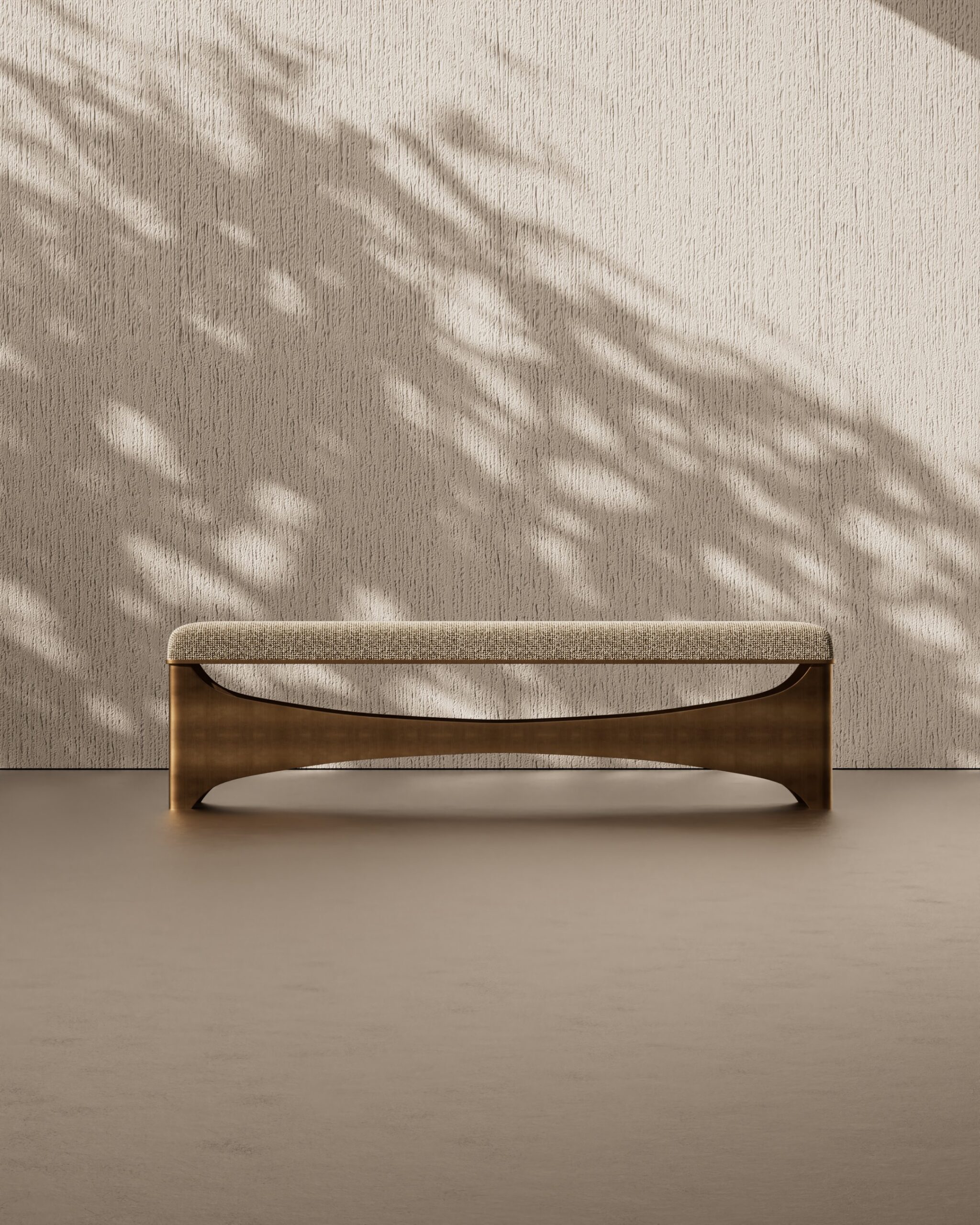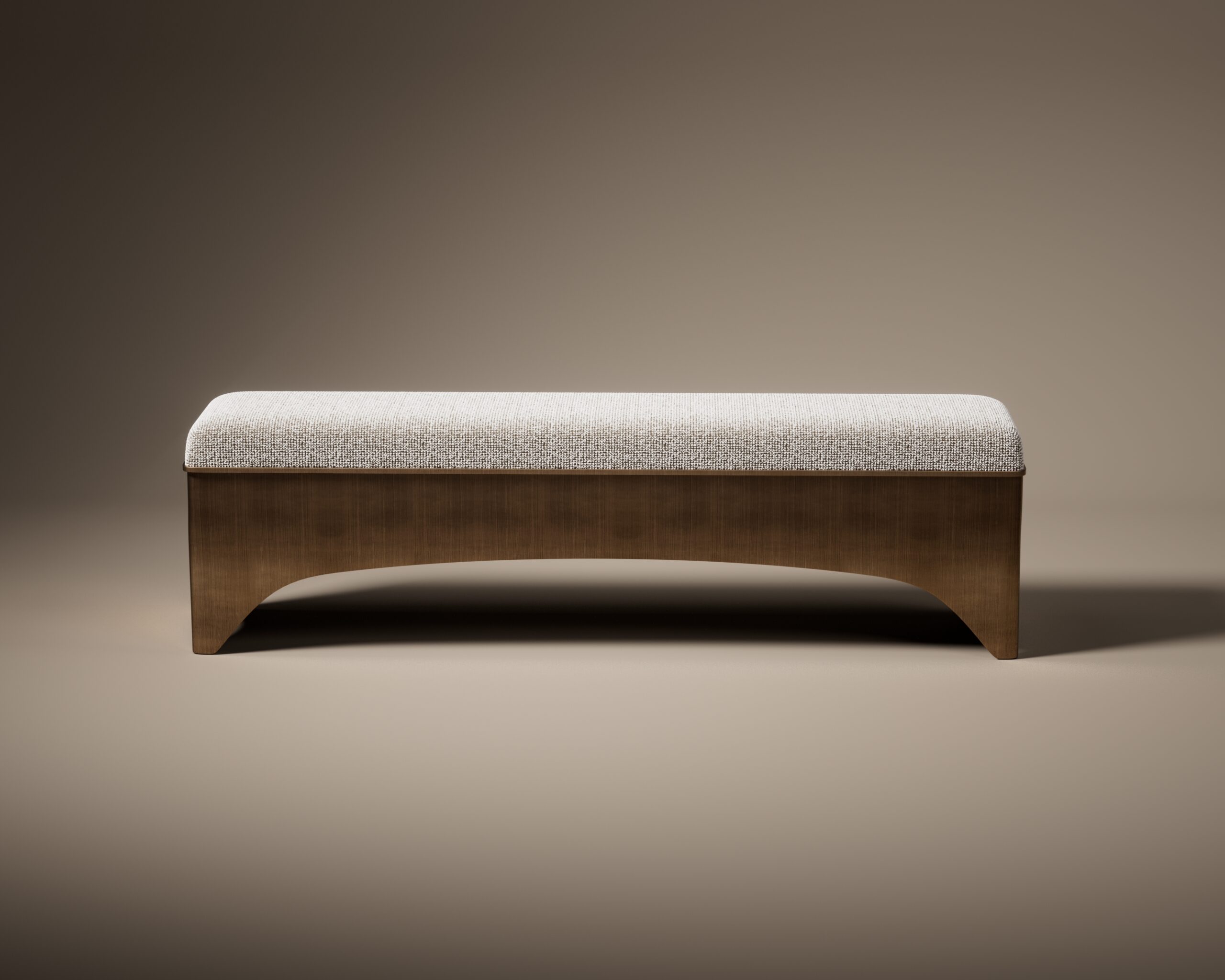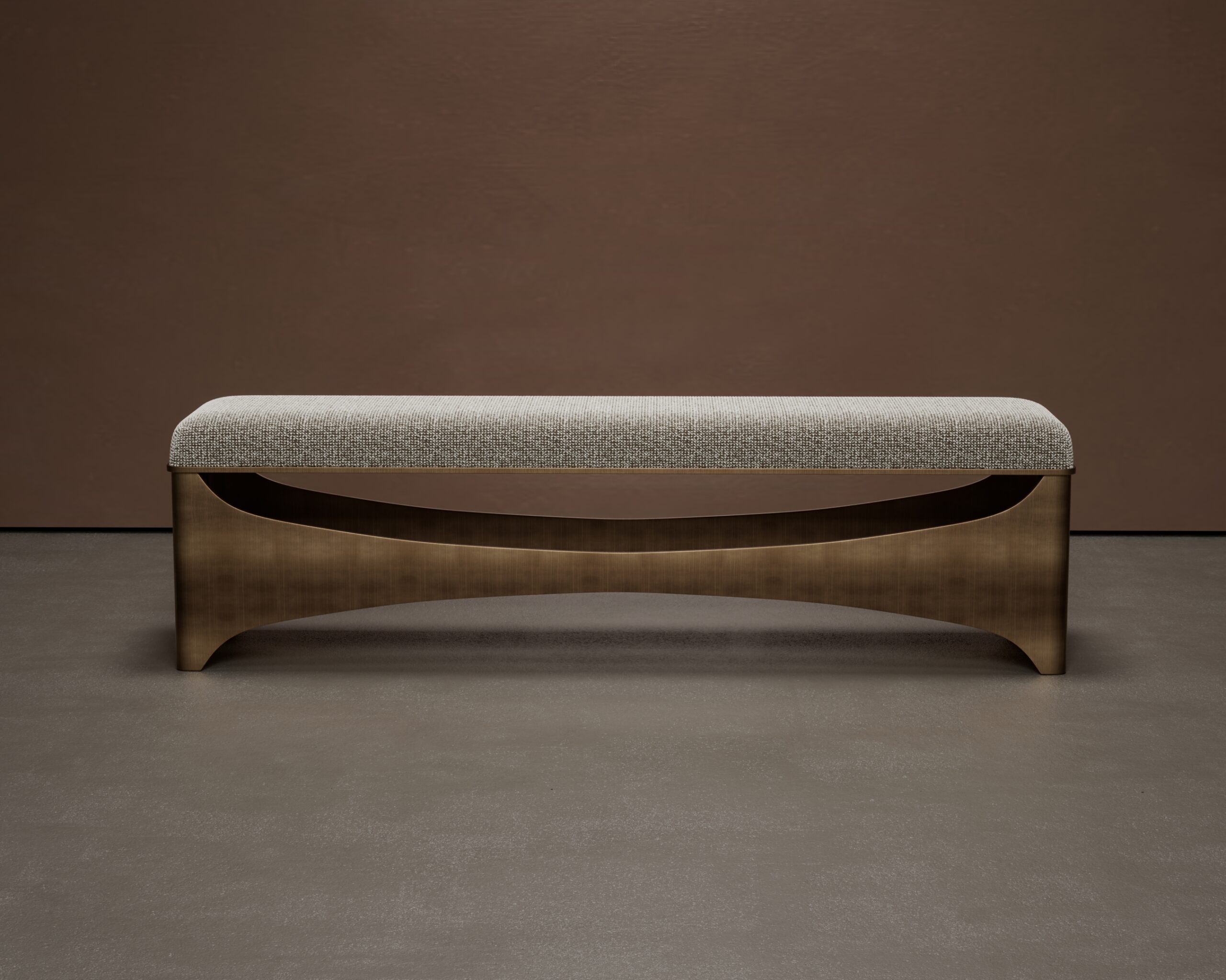 The SWAY bench is a striking combination of soft comfort and architectural rigidity. Its rectangular seat is upholstered in a tactile oatmeal woven fabric, offering a neutral and inviting surface. The design is anchored by a dramatic brushed metal base, where the stretcher bar features a deep, graceful curve—or “sway”—that connects the solid, wide end supports, creating a sense of movement and balance within a static form.