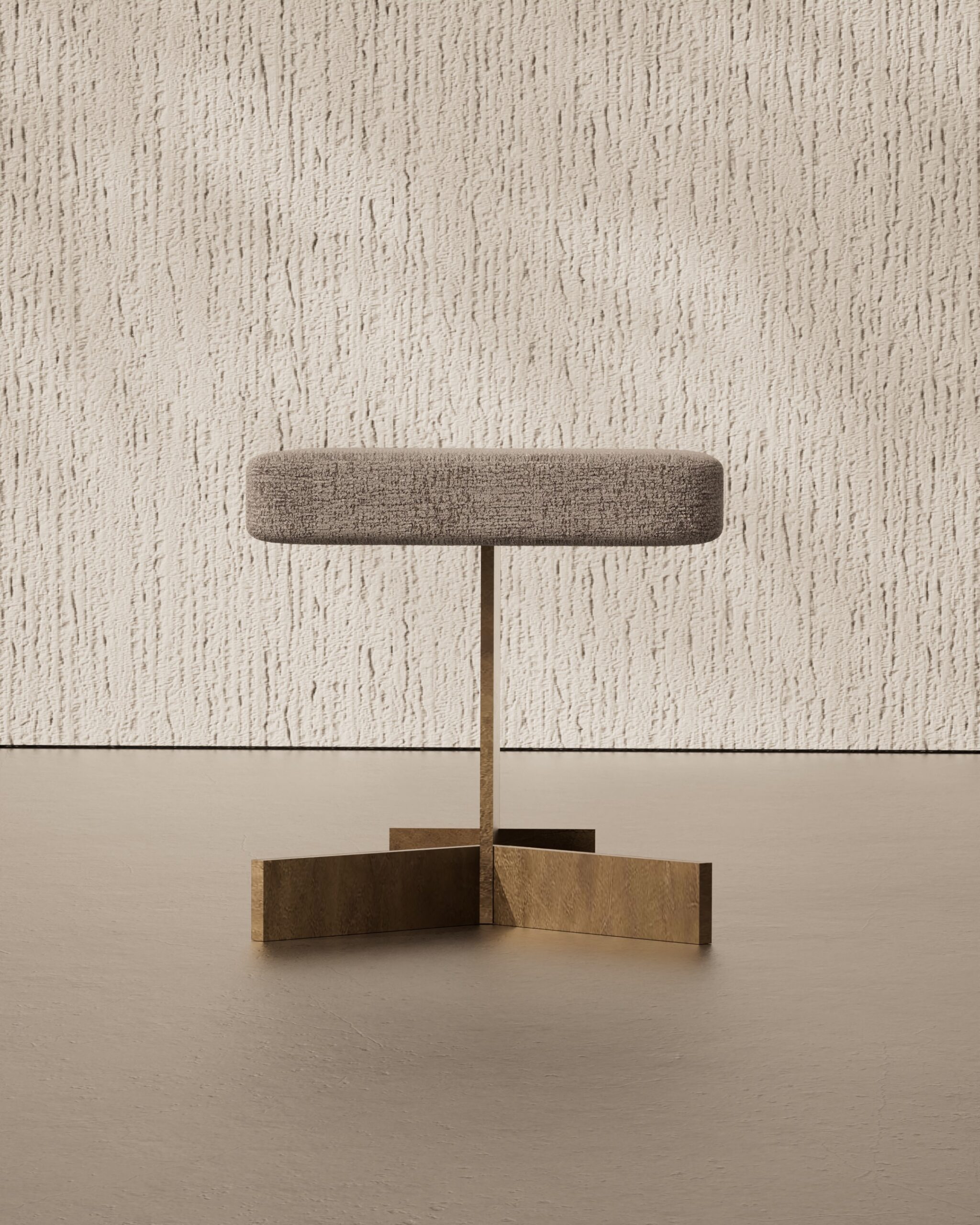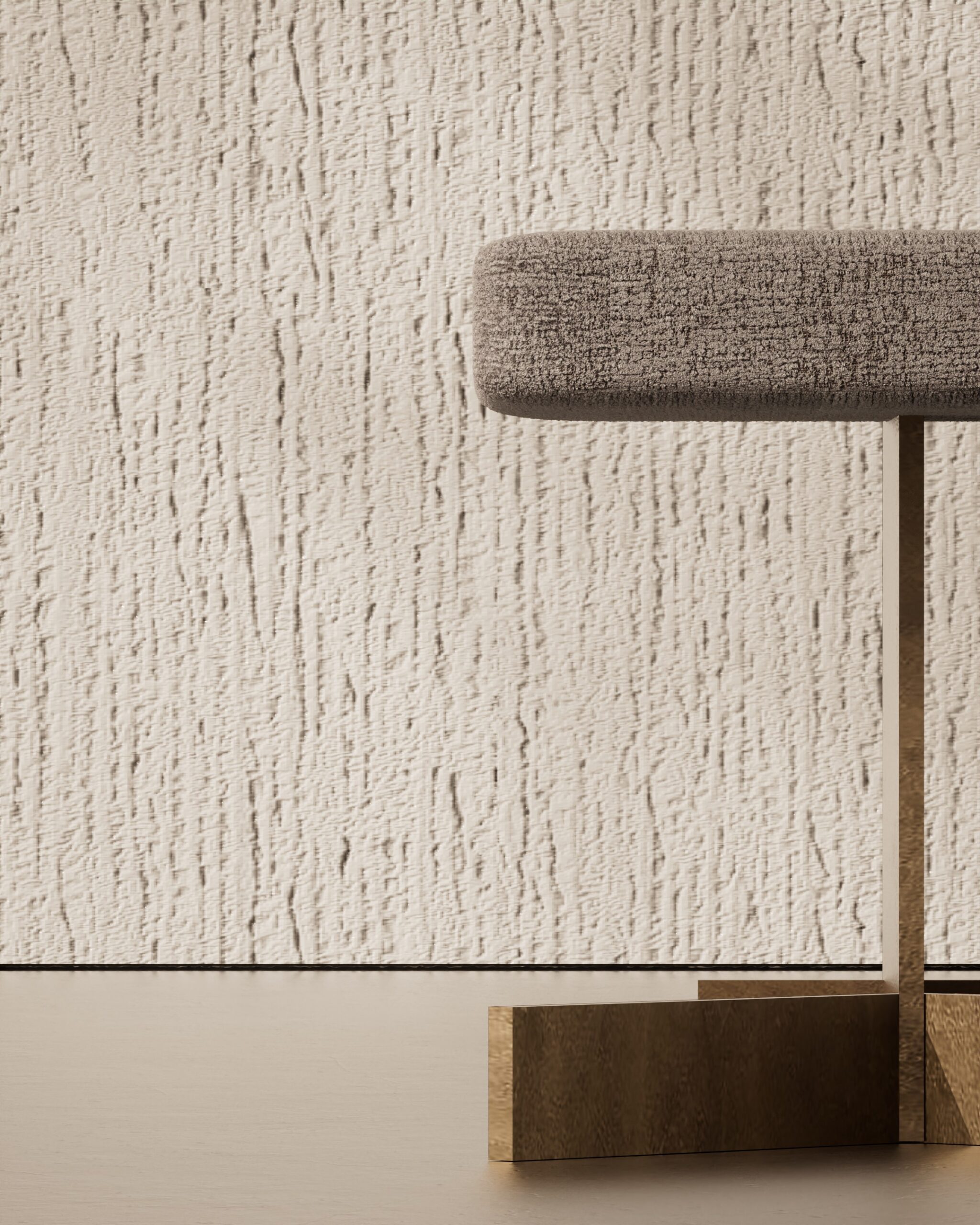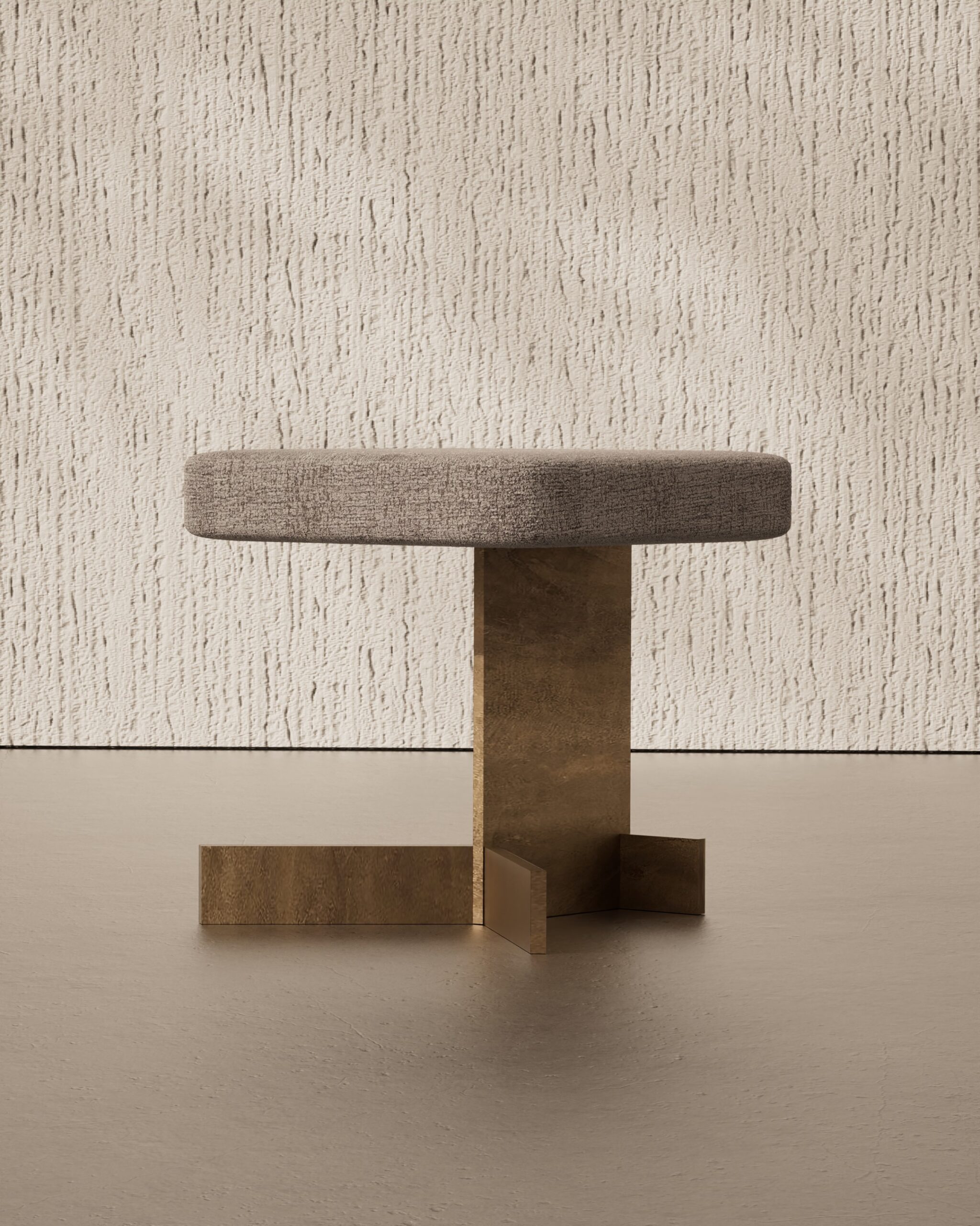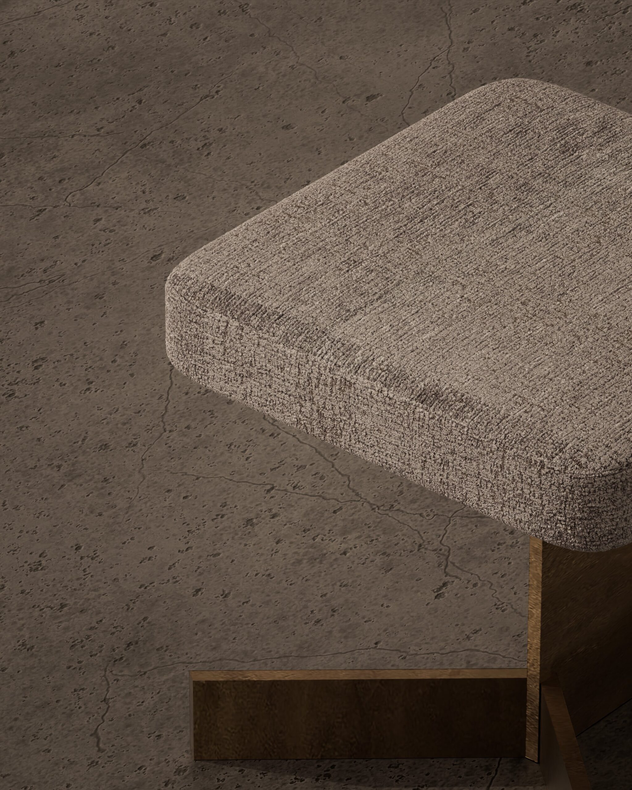 The TASSEL pouf is a study in tactile rhythm and material layering. Part of our Design Studio Collection, the piece is defined by its clean cylindrical body, entirely encased in a matte champagne metallic shroud that displays a fine, horizontal brushed texture. The top of the drum rises to meet a slightly domed seat upholstered in a warm, earth-toned woven textile. The design’s namesake detail is found at the base, where a thick, architectural fringe of dark fiber emerges from beneath the metal, creating a soft, sweeping foundation that contrasts with the rigid precision of the metallic exterior.