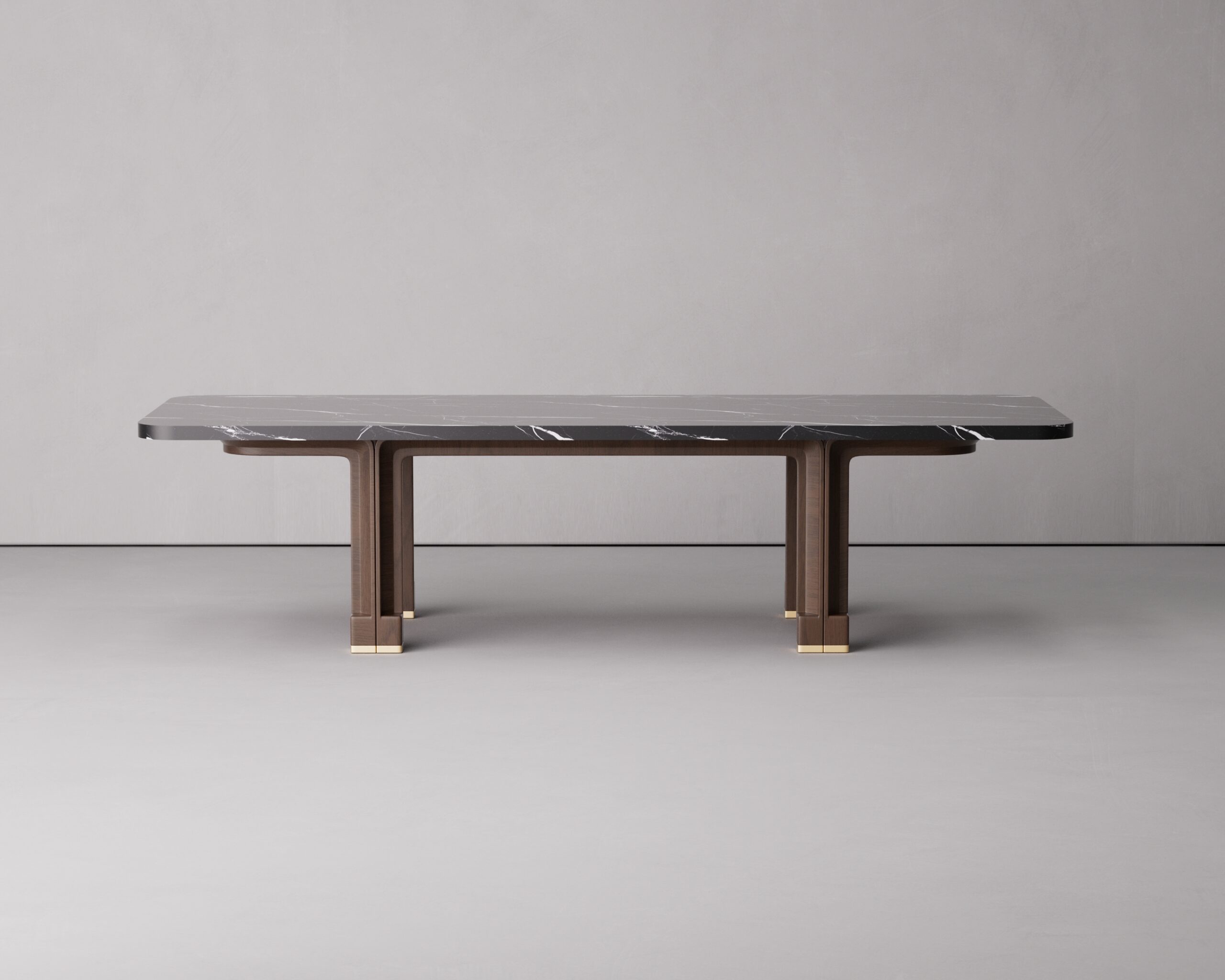 The visual narrative is defined by its unique pedestal supports: four deep ebony wooden legs that sweep outward in a precise, T-shaped architectural curve to cradle the stone surface. This structural junction creates a subtle shadow gap, giving the heavy marble top a sense of suspended elegance. Each leg is finished with a brushed gold metallic cap at the floor, serving as a refined jewel that grounds the piece’s substantial volume. The TAVOLO balances the permanent, tectonic weight of natural stone with artisanal woodcraft, offering a commanding focal point for high-end dining environments.