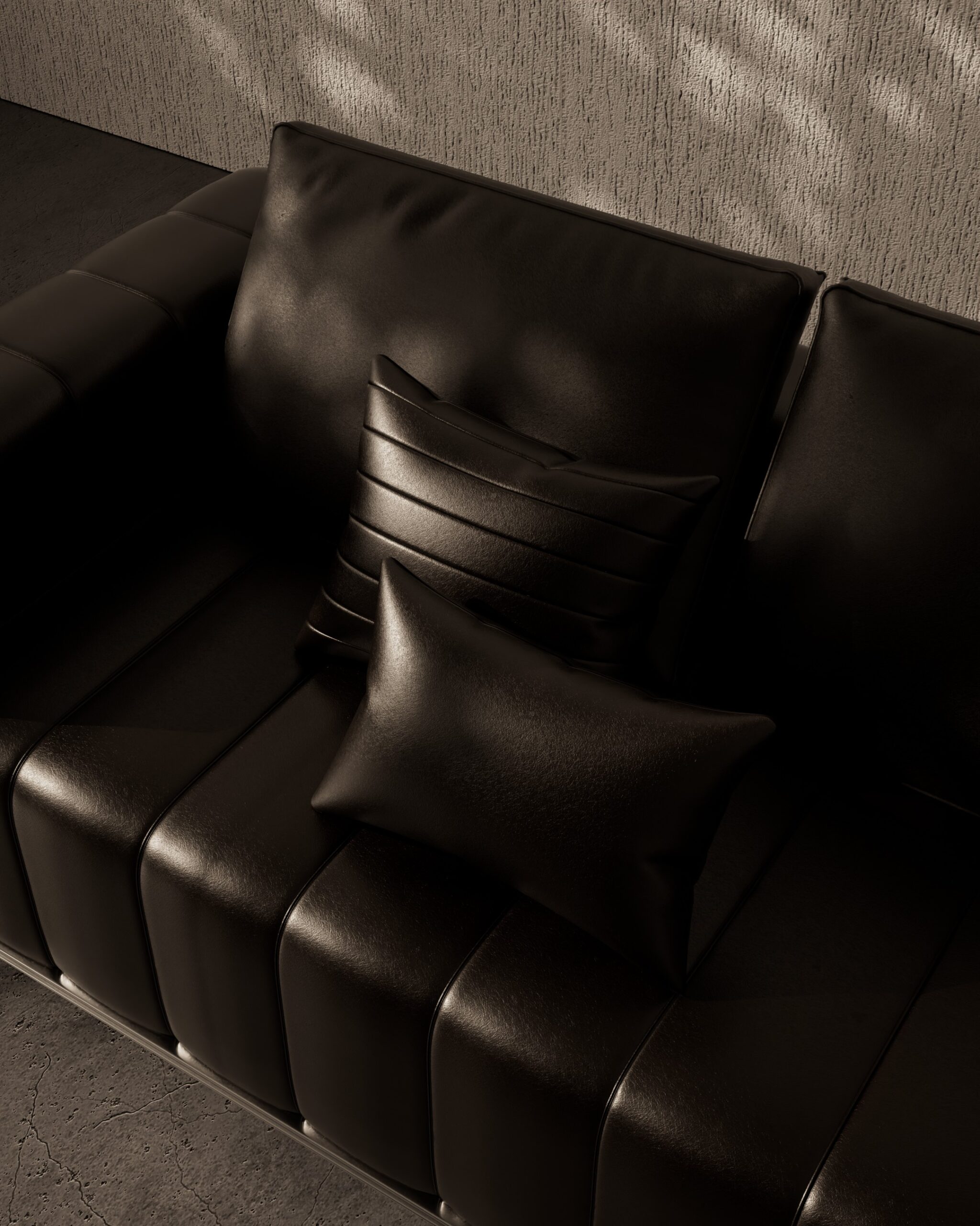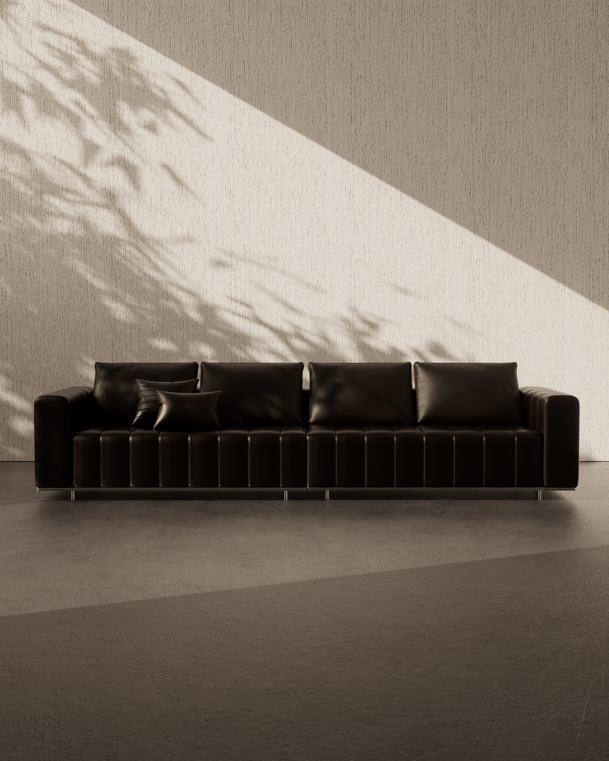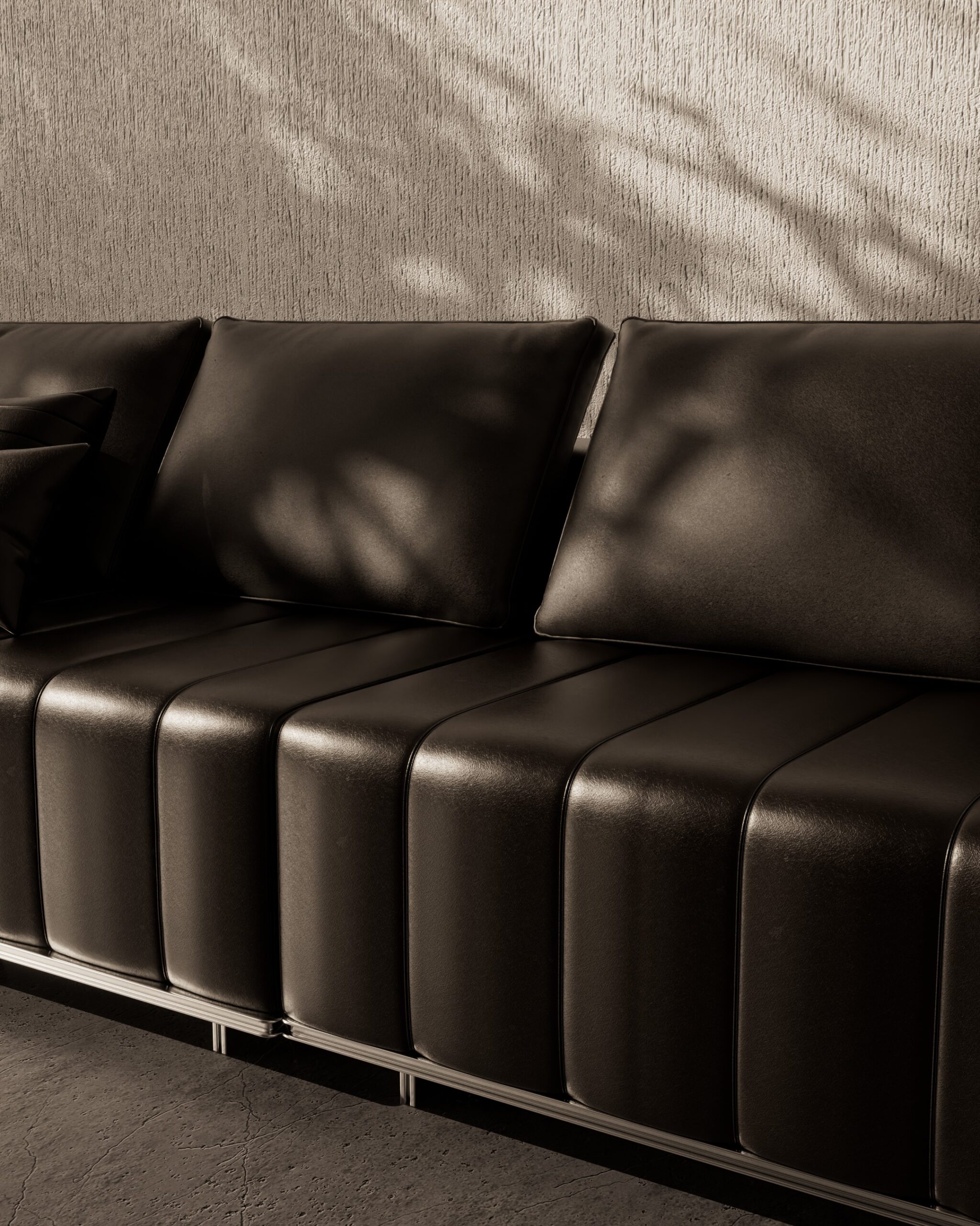 The TENNESSEE is a moody, modern statement piece defined by its low-slung silhouette and architectural structure. The sofa features bold vertical channel tufting along the seat and arms that contrasts with the relaxed, plush back cushions, balancing industrial edge with quiet luxury. Supported by a minimalist metal base, it anchors the space with a sophisticated, masculine presence.
