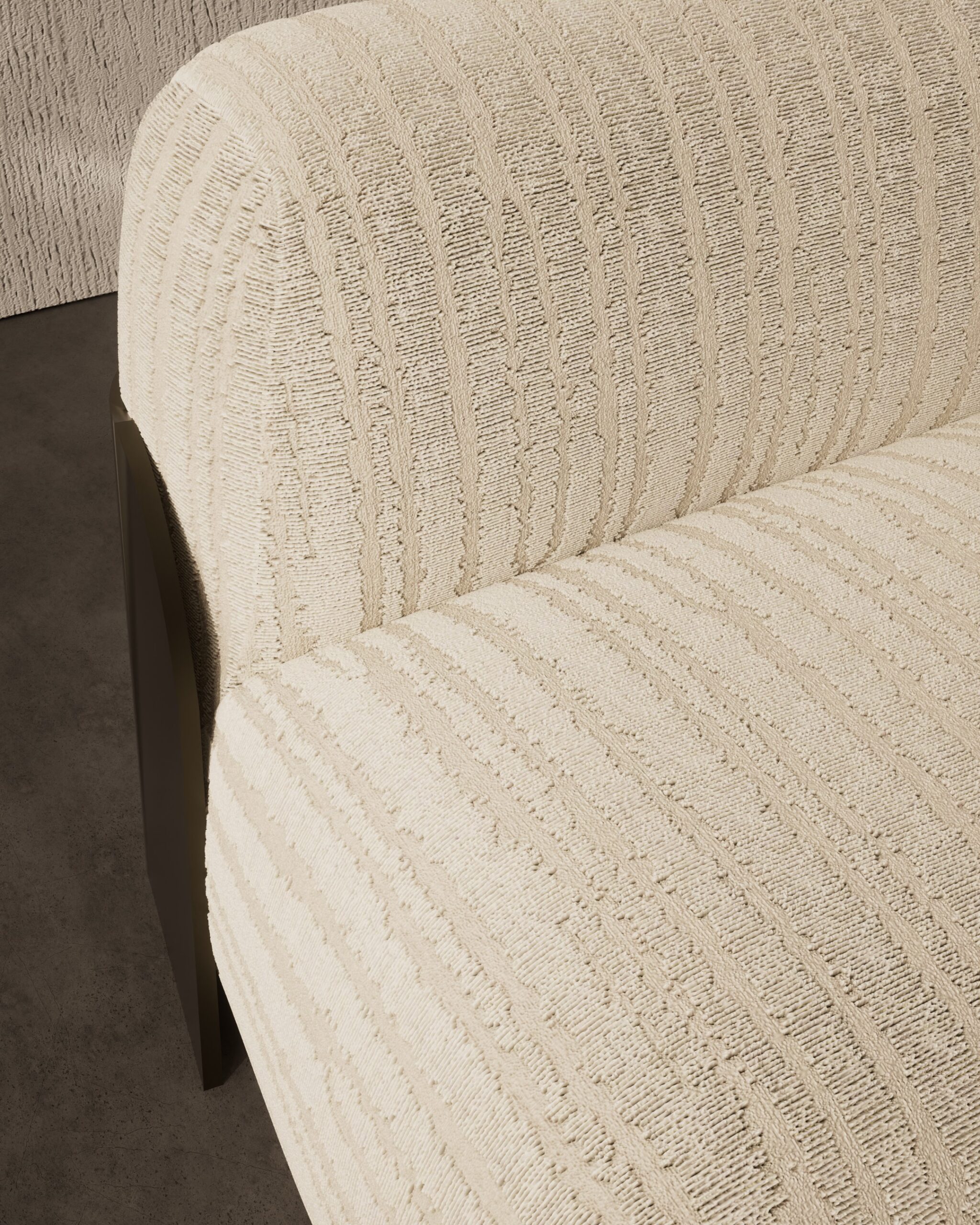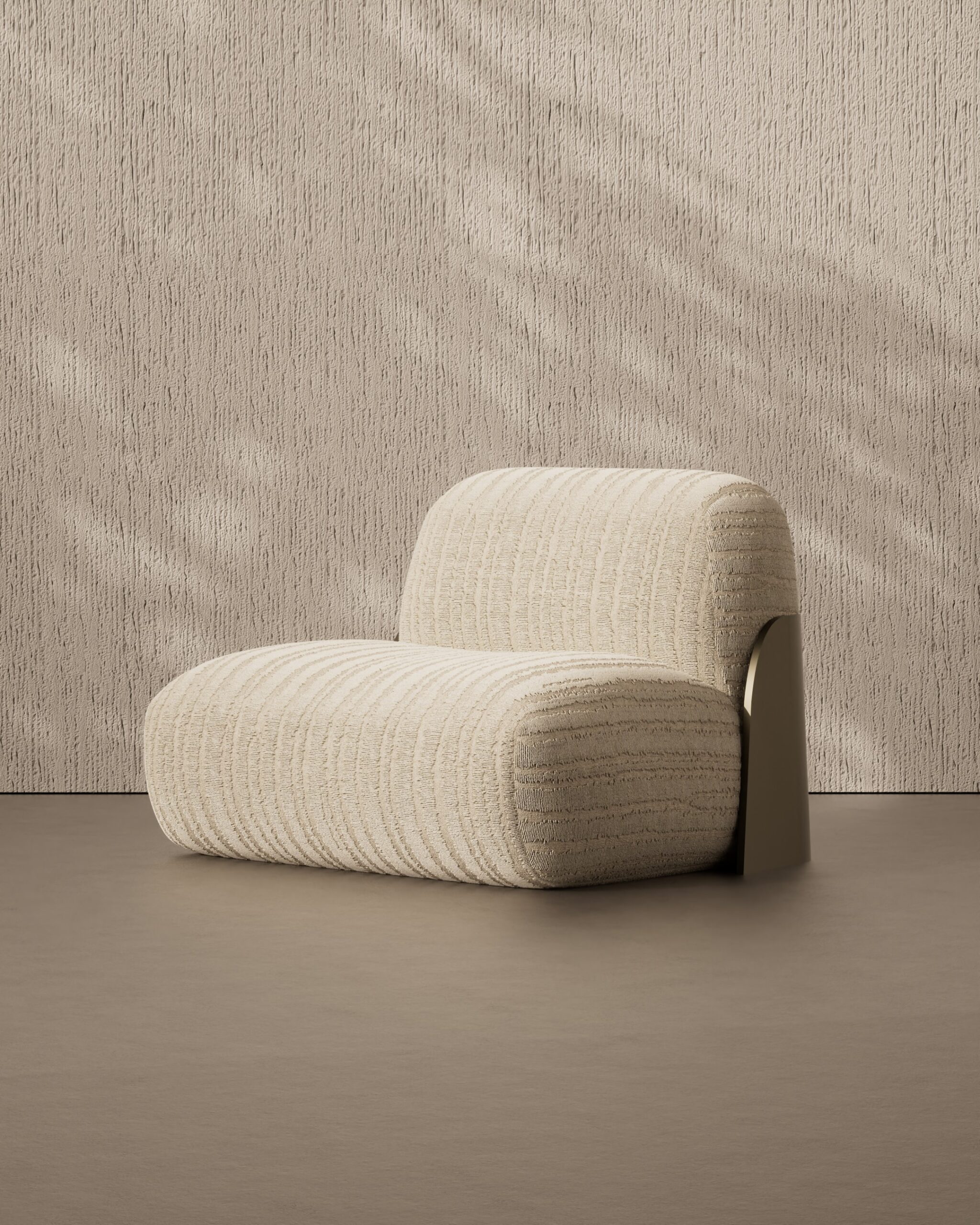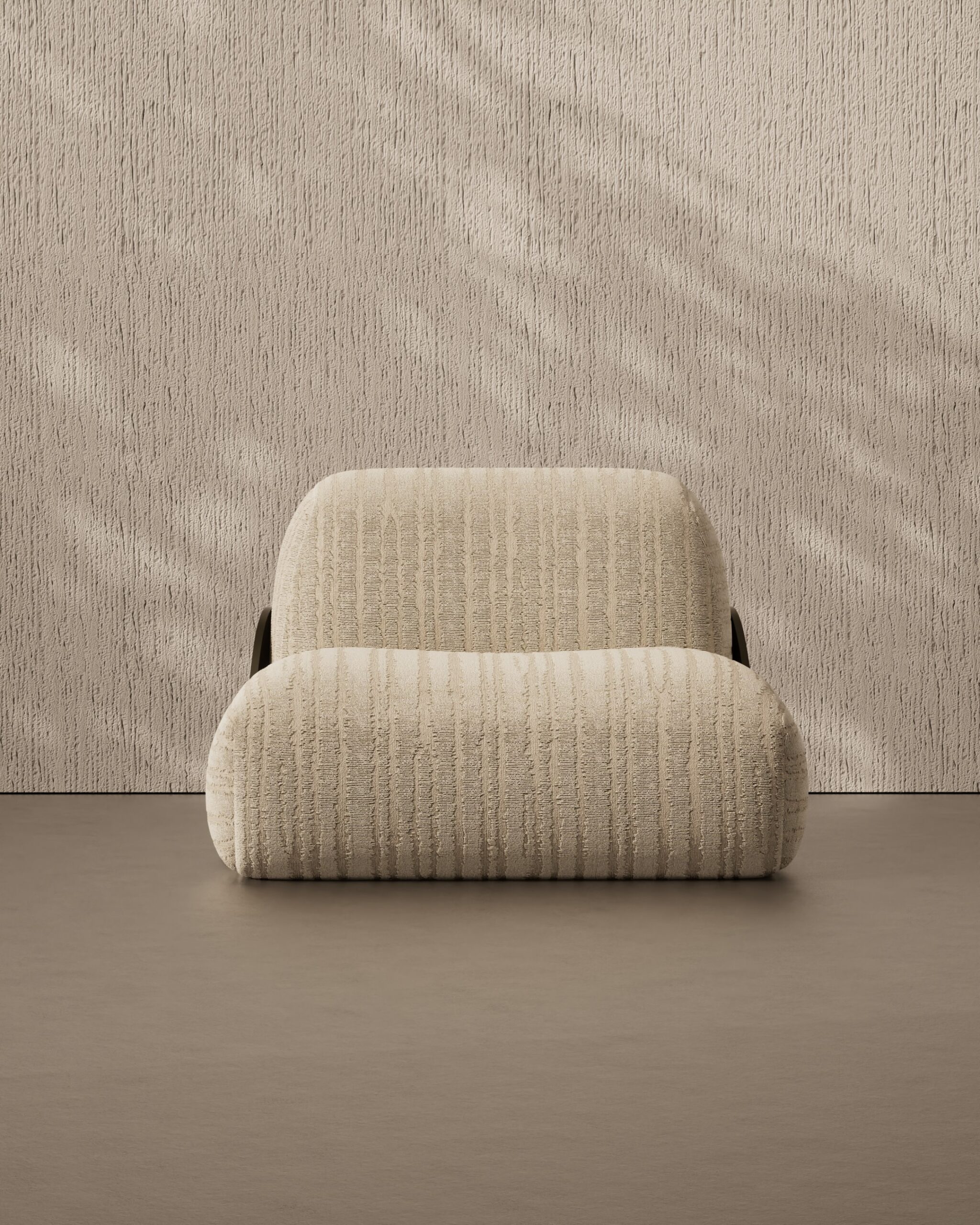 The TESSELLA armchair is a study in tactile minimalism, designed to appear as a soft, continuous landscape of comfort. Its silhouette is defined by two voluminous, rounded forms—the seat and back—that seem to interlock effortlessly, resting directly on the floor for a relaxed, lounge-like appeal. The upholstery is the focal point, featuring a heavy, vertically ribbed weave in a calming oatmeal tone that mimics organic patterns like sand ripples or tree bark. This softness is structurally embraced by a sleek, dark bronze metal plate that curves around the rear, acting as a sophisticated “exoskeleton” that contrasts sharply with the plush, deep-pile fabric.