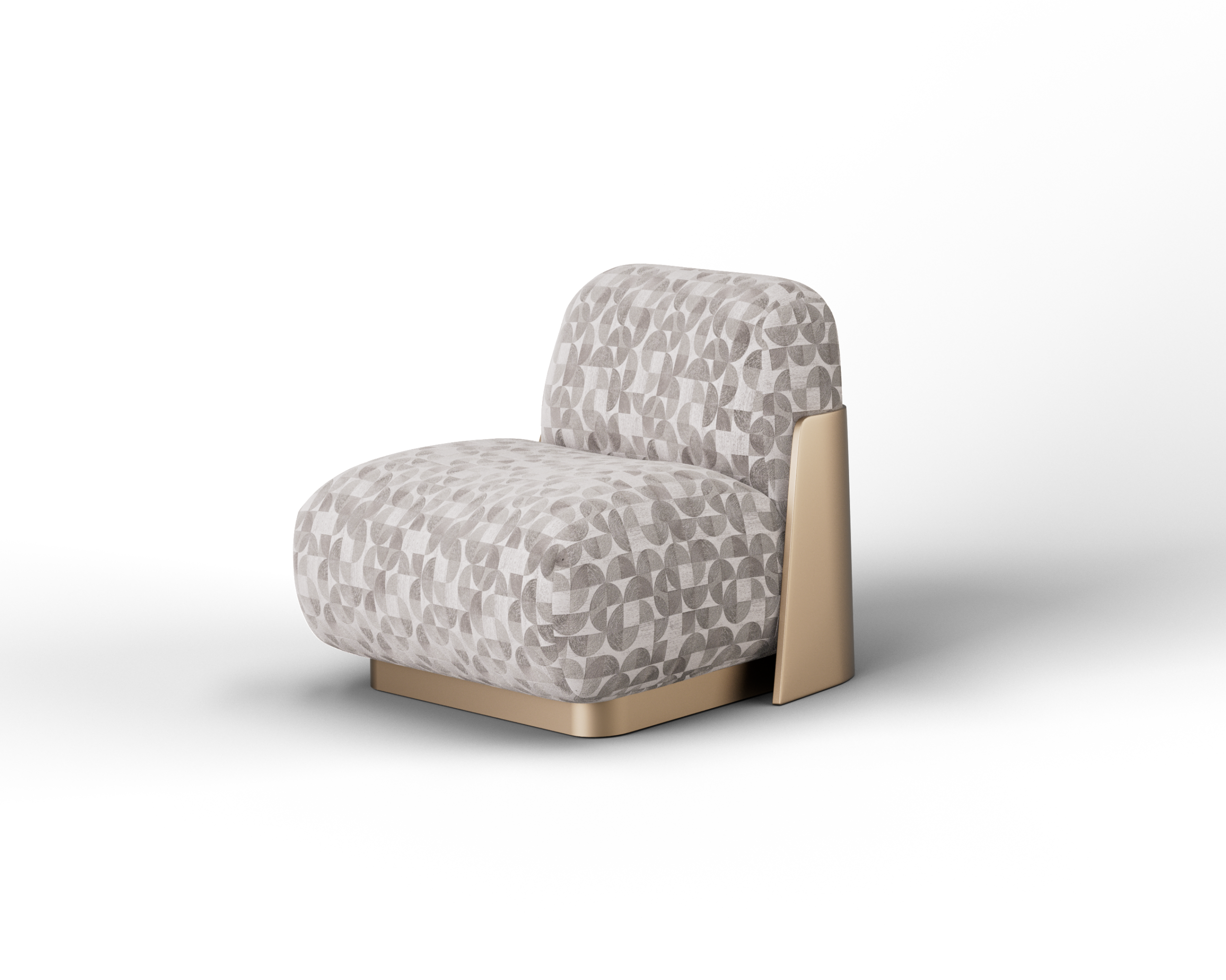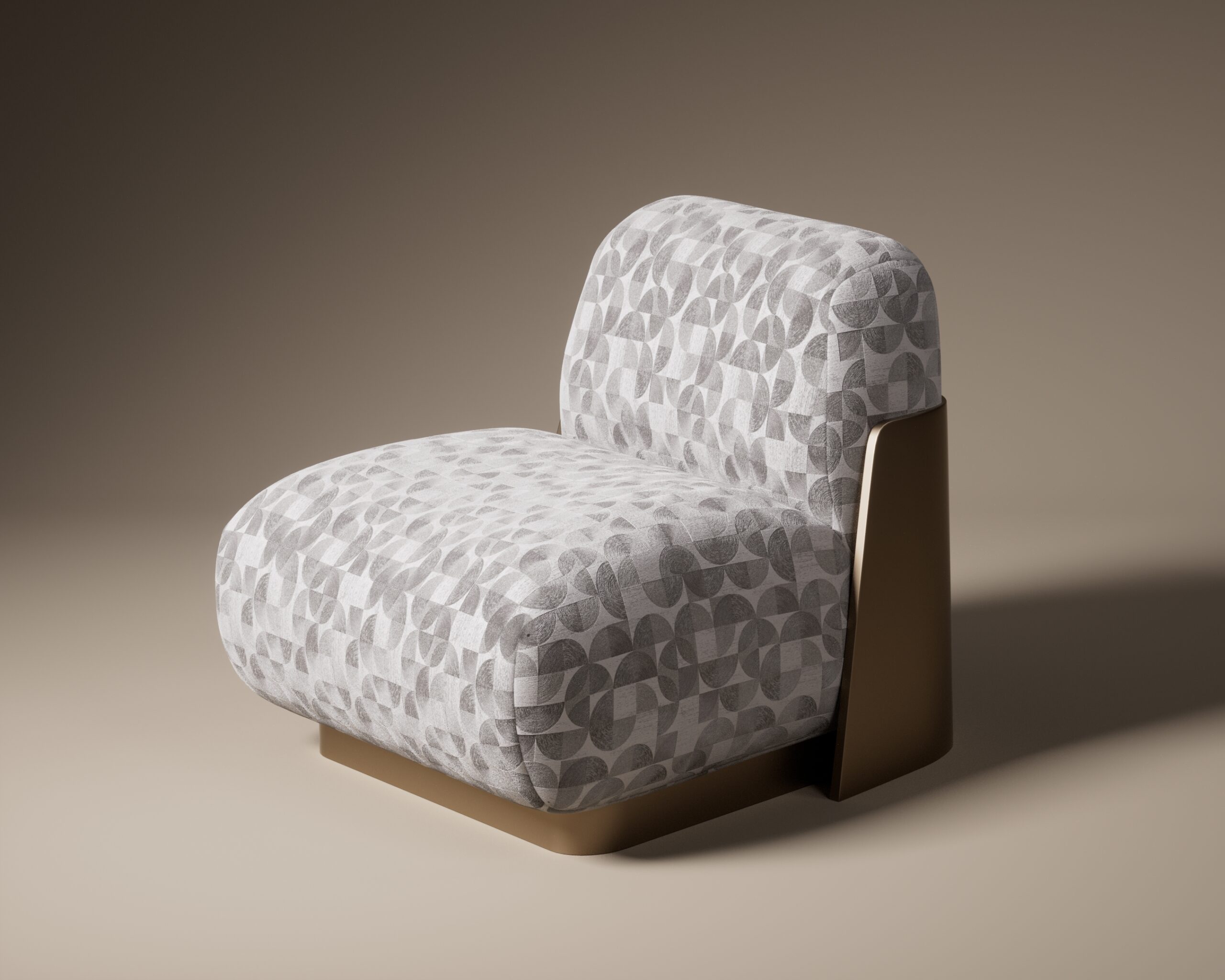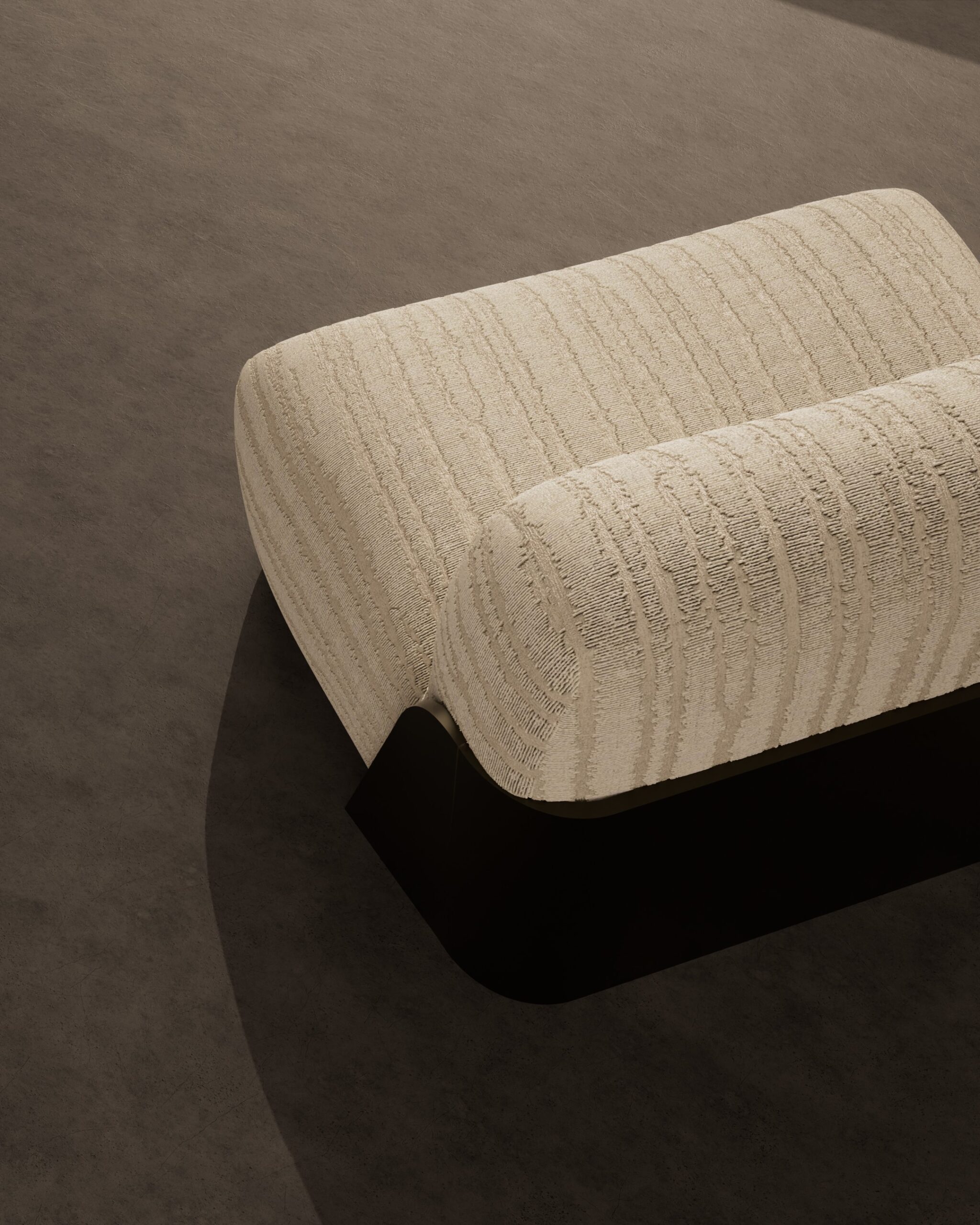 The TESSELLA armchair is a study in tactile minimalism, designed to appear as a soft, continuous landscape of comfort. Its silhouette is defined by two voluminous, rounded forms—the seat and back—that seem to interlock effortlessly, resting directly on the floor for a relaxed, lounge-like appeal. The upholstery is the focal point, featuring a heavy, vertically ribbed weave in a calming oatmeal tone that mimics organic patterns like sand ripples or tree bark. This softness is structurally embraced by a sleek, dark bronze metal plate that curves around the rear, acting as a sophisticated “exoskeleton” that contrasts sharply with the plush, deep-pile fabric.