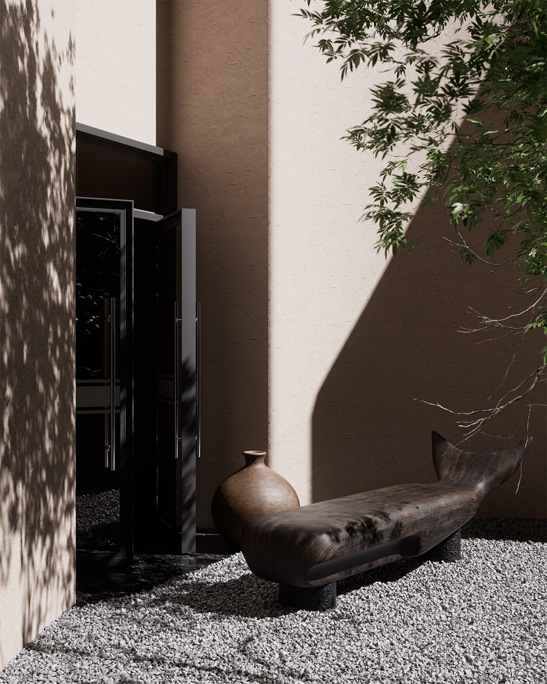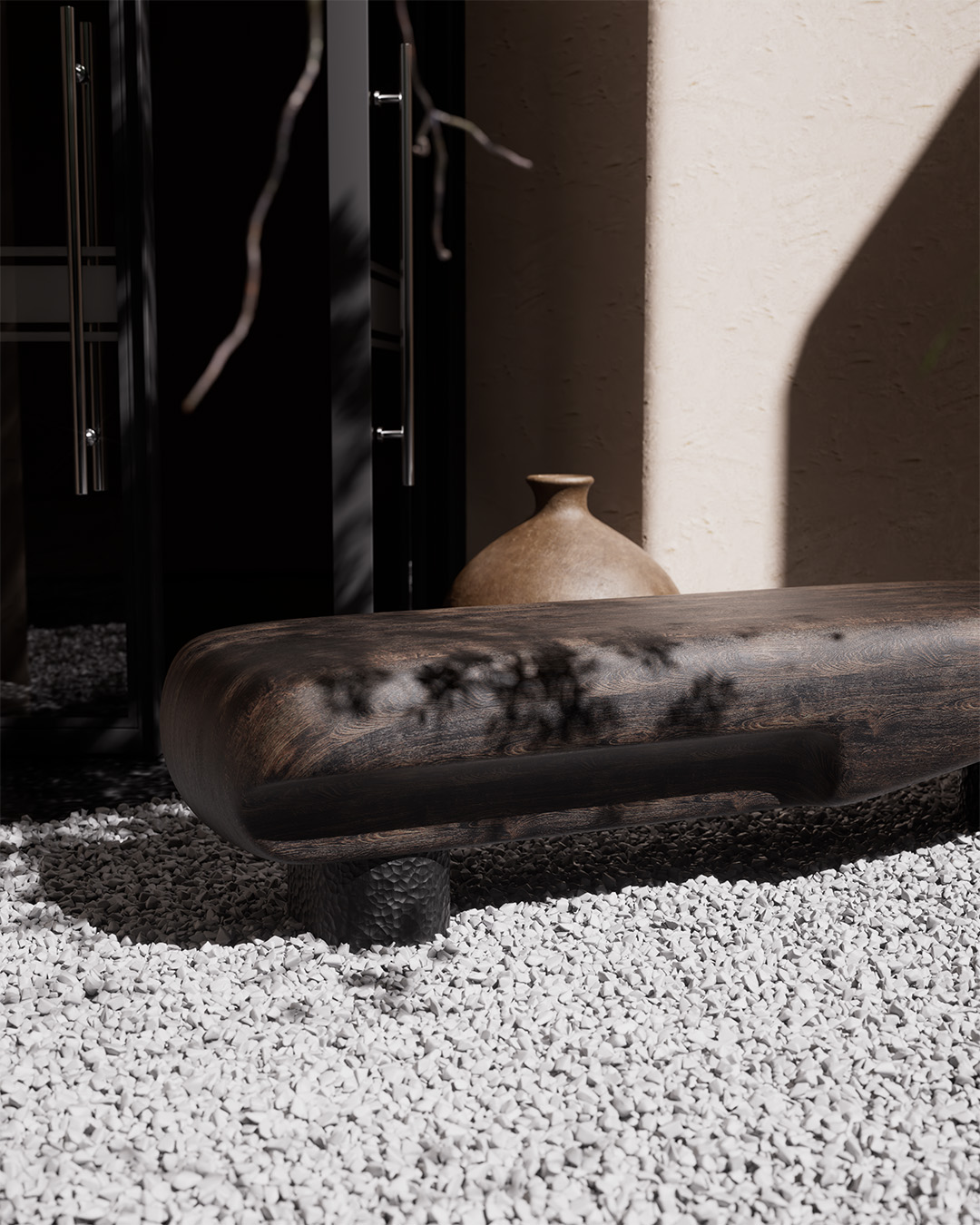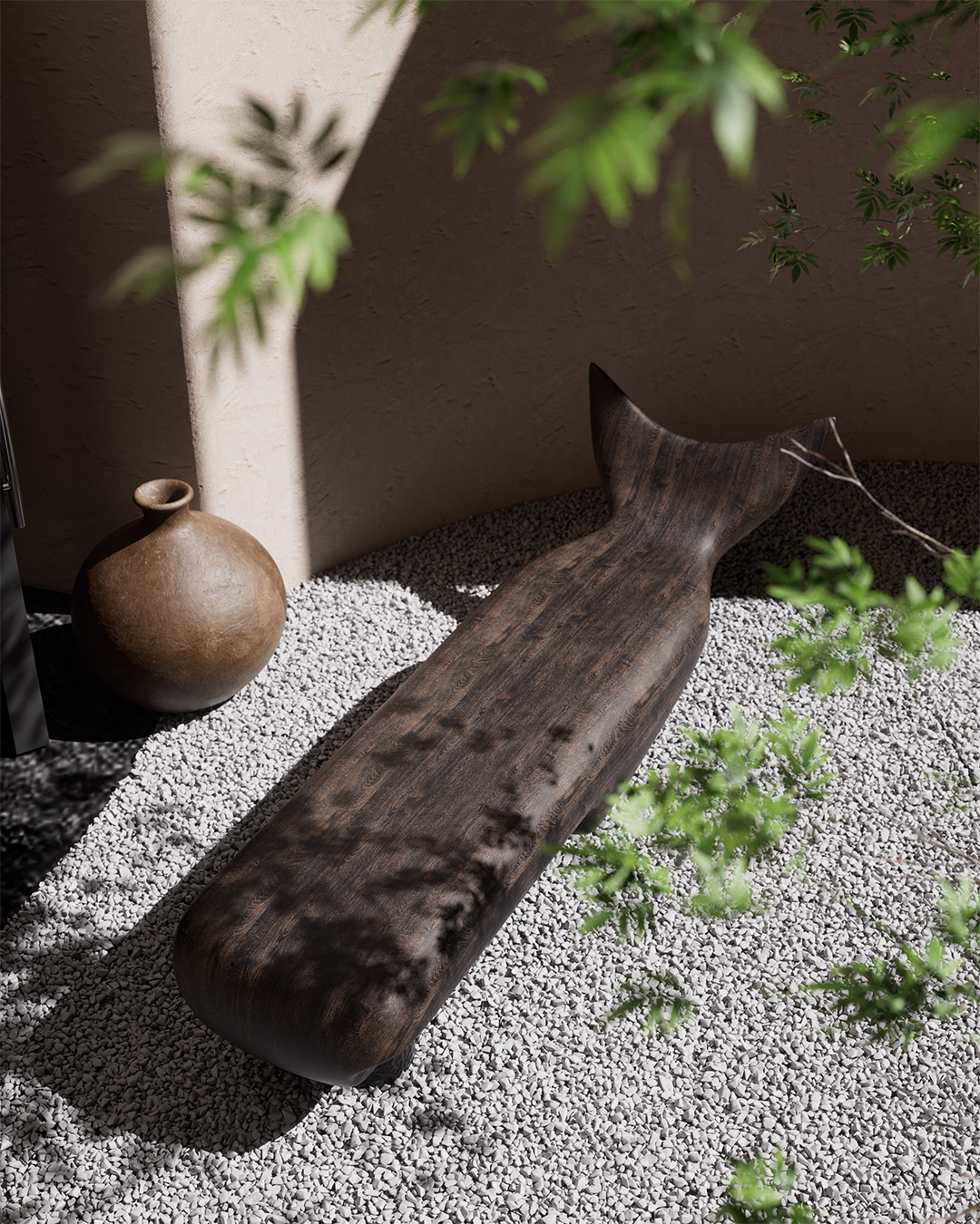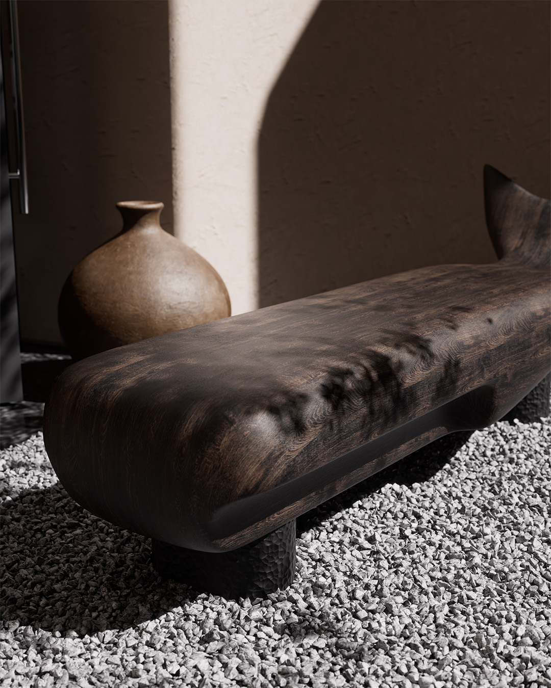 The WHALE BENCH is a poetic convergence of sculpture and function, capturing the serene movement of marine life in solid timber. Part of the RAW Collection, this piece creates a playful yet sophisticated narrative with its smooth, hydrodynamic body that tapers elegantly into a raised tail fin. The bench celebrates the natural beauty of the wood, showcasing deep, swirling grain patterns across its sleek surface. This fluid form is grounded by stout, blackened legs featuring a rough-hewn, chiseled texture, offering a tactile contrast between the polished “creature” and its rugged, earthly foundation.
