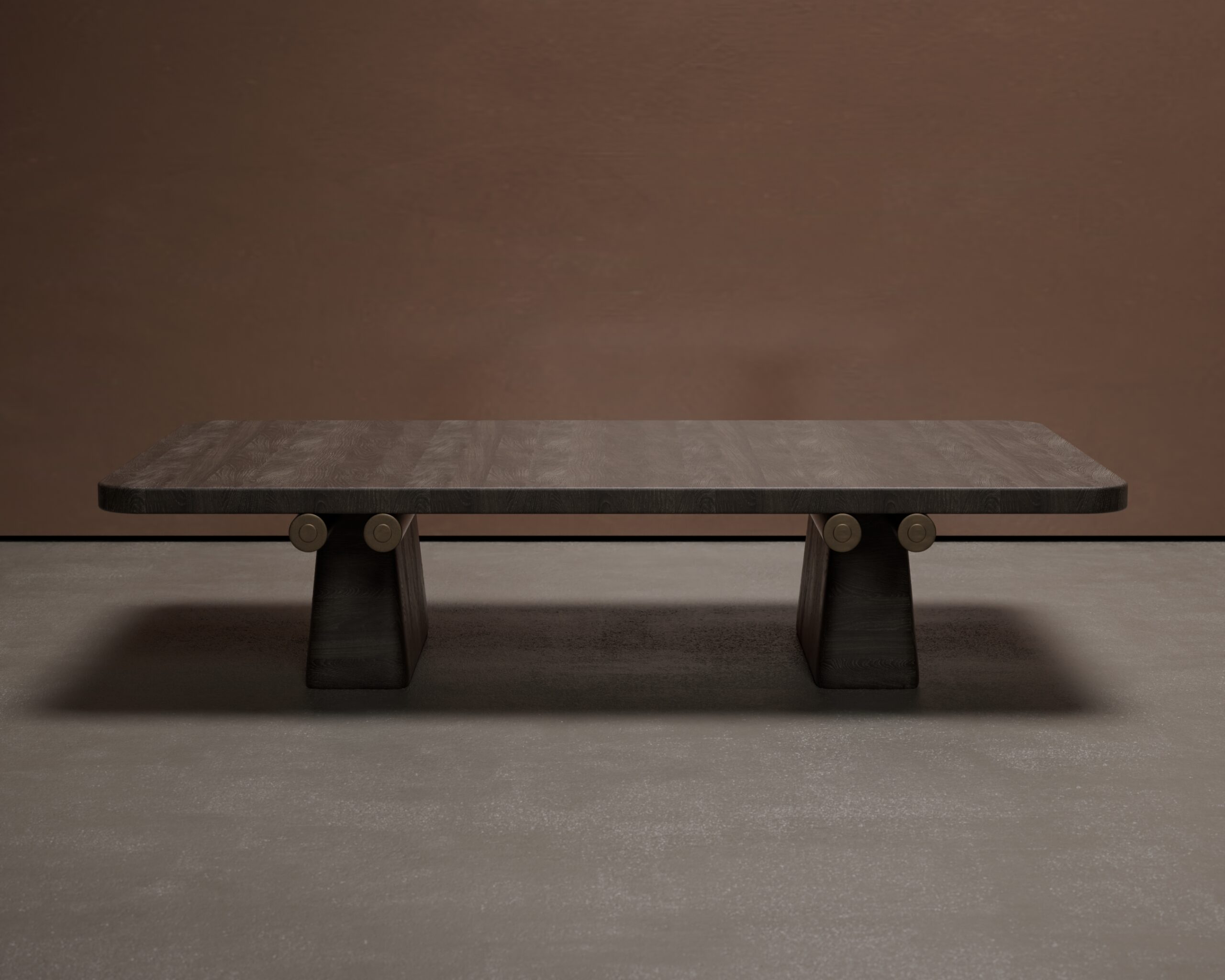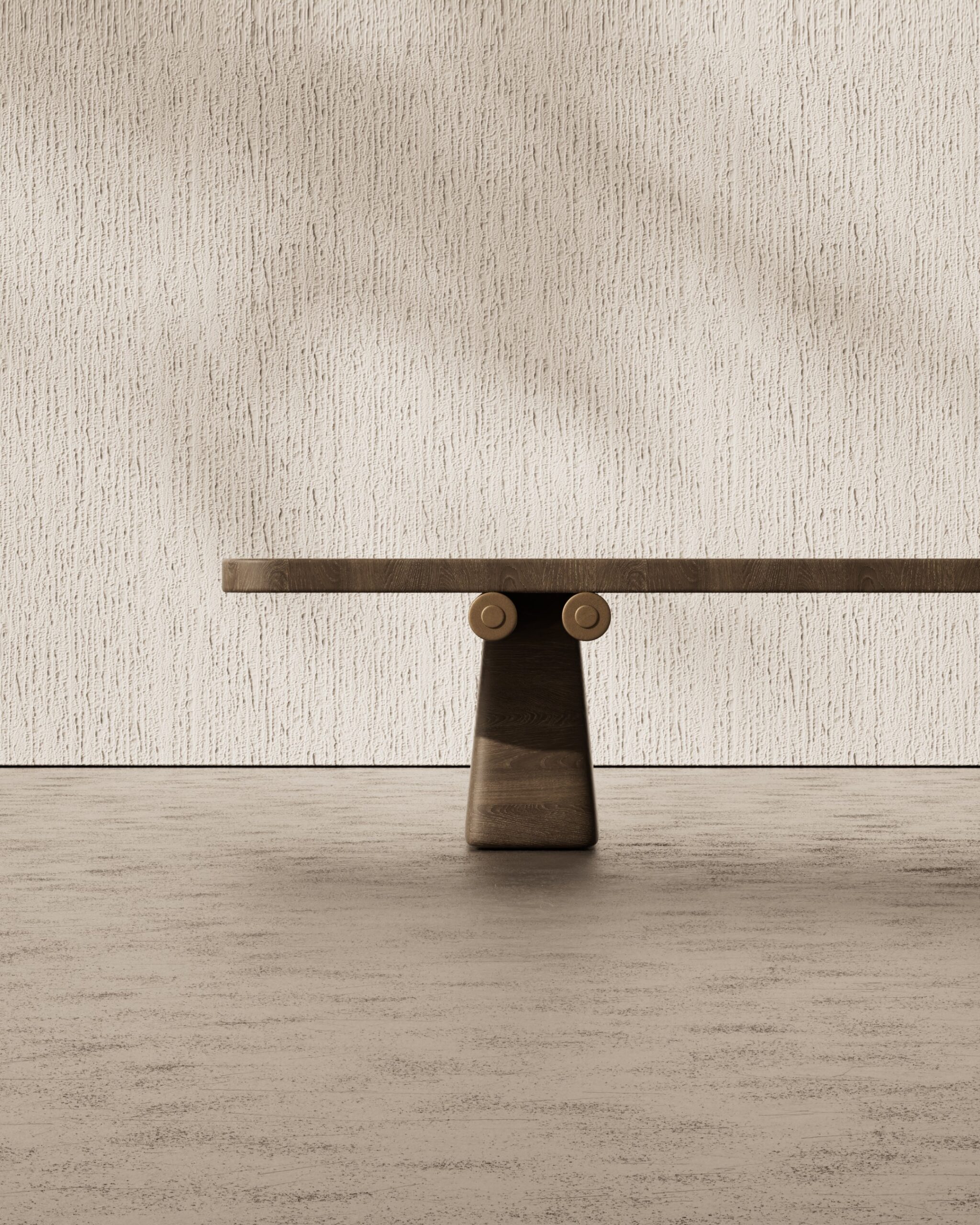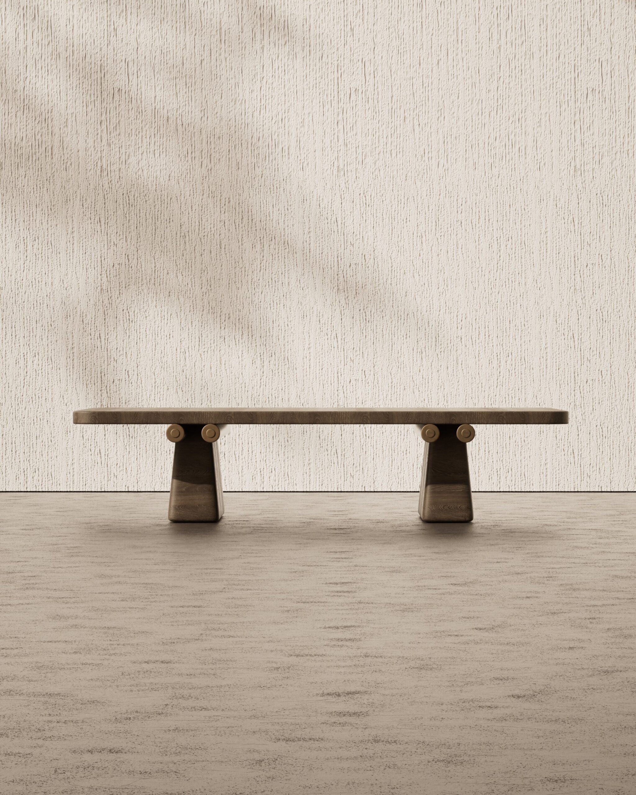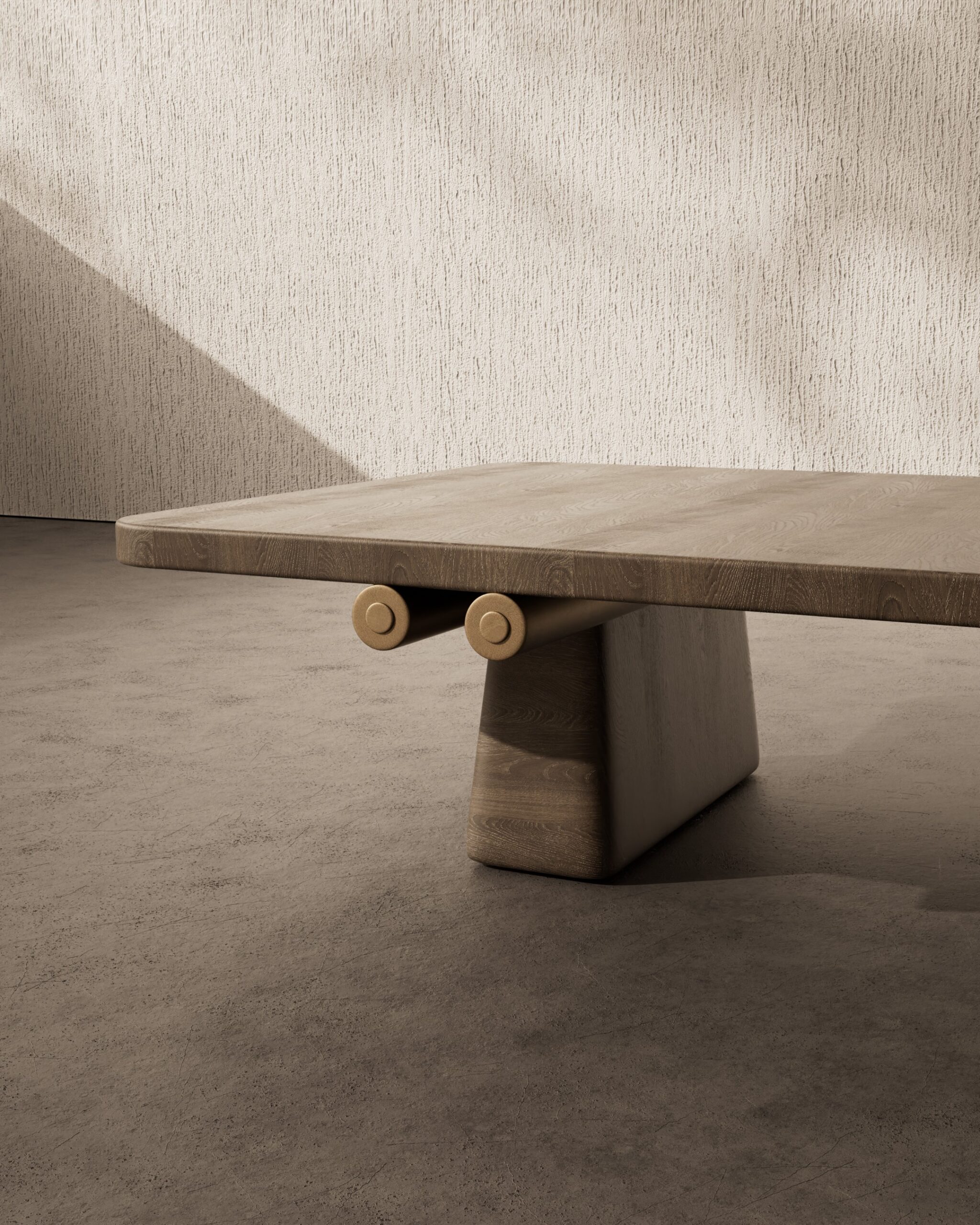 The TOPO center table is a study in structural clarity and refined material joinery. Part of our Design Studio Collection, the piece features a substantial natural oak surface characterized by its soft, beveled perimeter and warm, open grain. The table is anchored by a matching wooden pedestal base, which is architecturally reinforced by brushed champagne metallic rods. These rods penetrate the central support and terminate in decorative circular caps on the exterior, creating a balanced dialogue between traditional timber craftsmanship and sleek, industrial hardware.