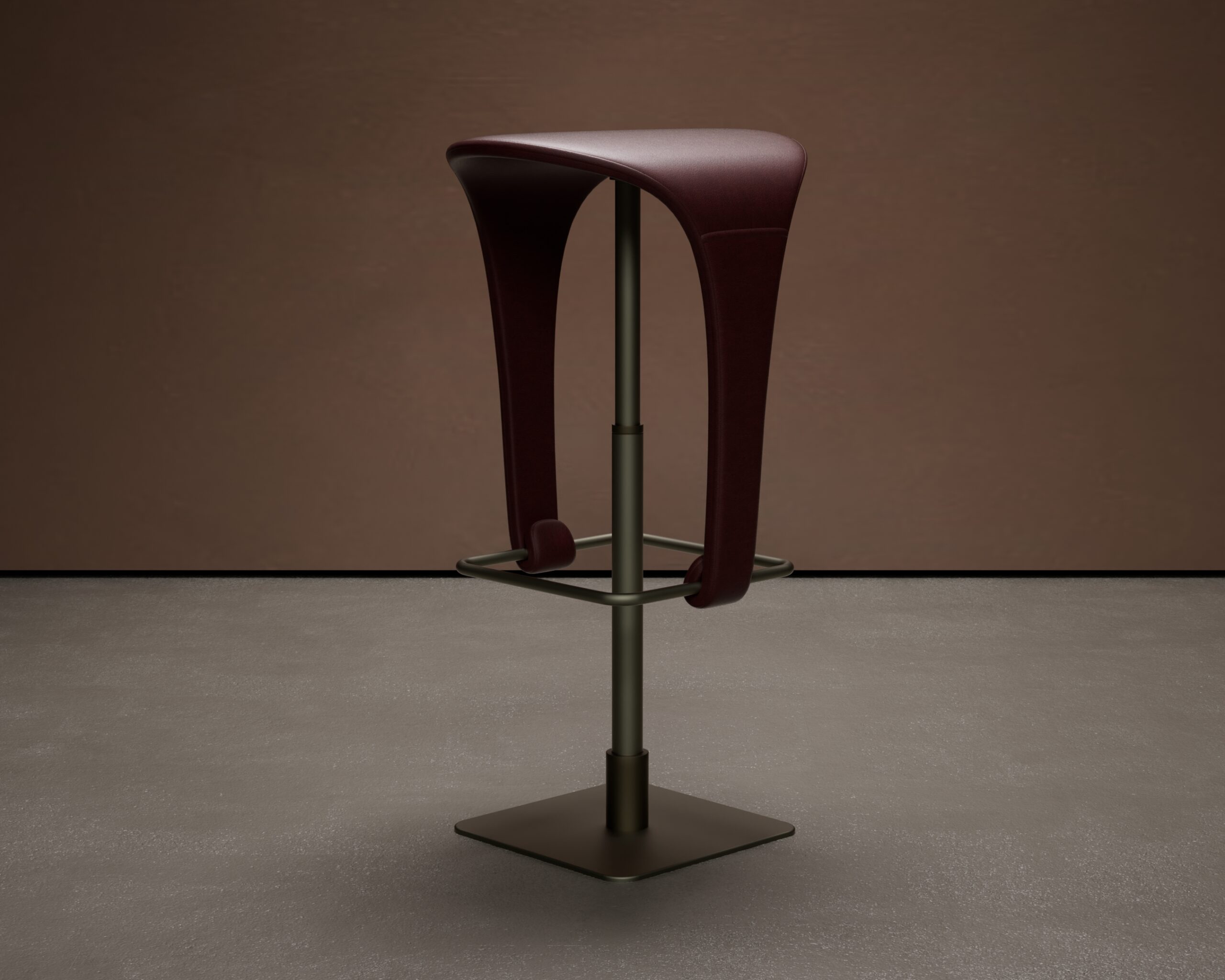 The VEGA bar stool is a study in suspended geometry and fluid architectural lines. Part of our Design Studio Collection, it features a distinctive arched “ribbon” silhouette where the seat and side shrouds form a single, continuous curve upholstered in a rich deep rust textile. The stool is supported by a minimalist satin champagne pedestal that pierces through the upholstered form, anchored by a weighted square base and featuring a geometric wrap-around footrest. This interplay between the soft, draped volume of the seat and the rigid precision of the metallic skeleton creates a bold, sculptural statement for modern bar environments.