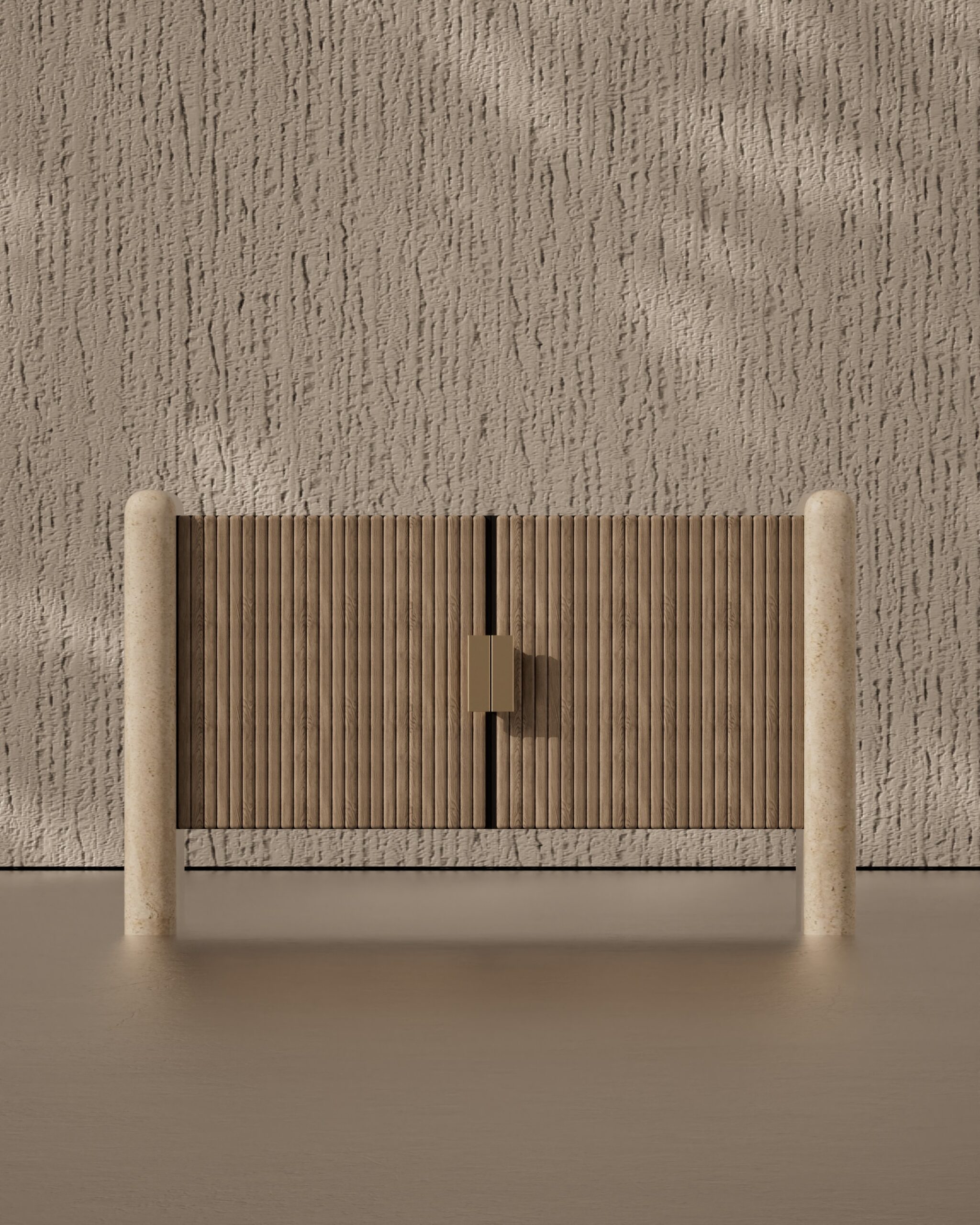 The VERDANT bedside table is a composition of rhythmic texture and monolithic presence. It features a central cabinet with fine vertical fluting in natural oak, flanked by two substantial, rounded travertine stiles that extend to form the piece’s structural legs. The design highlights the tonal harmony between the porous, sandy texture of the stone and the linear precision of the woodwork, finished with brushed brass pulls that provide a clean, architectural focal point.