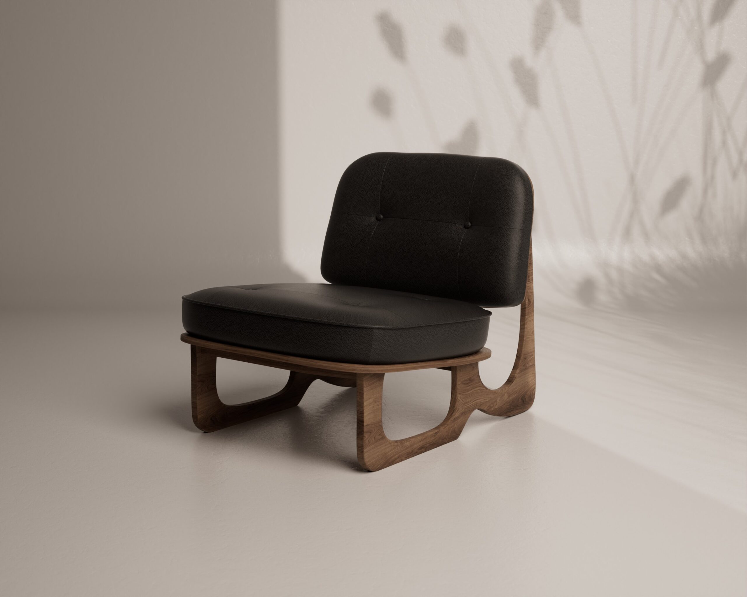 The VERO armchair is a sculptural masterpiece that harmonizes organic curves with mid-century refinement. Its low-slung profile is defined by a dramatic, continuous wooden base that loops beneath the seat, creating a unique architectural silhouette. Upholstered in rich black pebbled leather with delicate button tufting, the chair features a floating backrest that highlights the warmth and grain of the exposed timber shell.