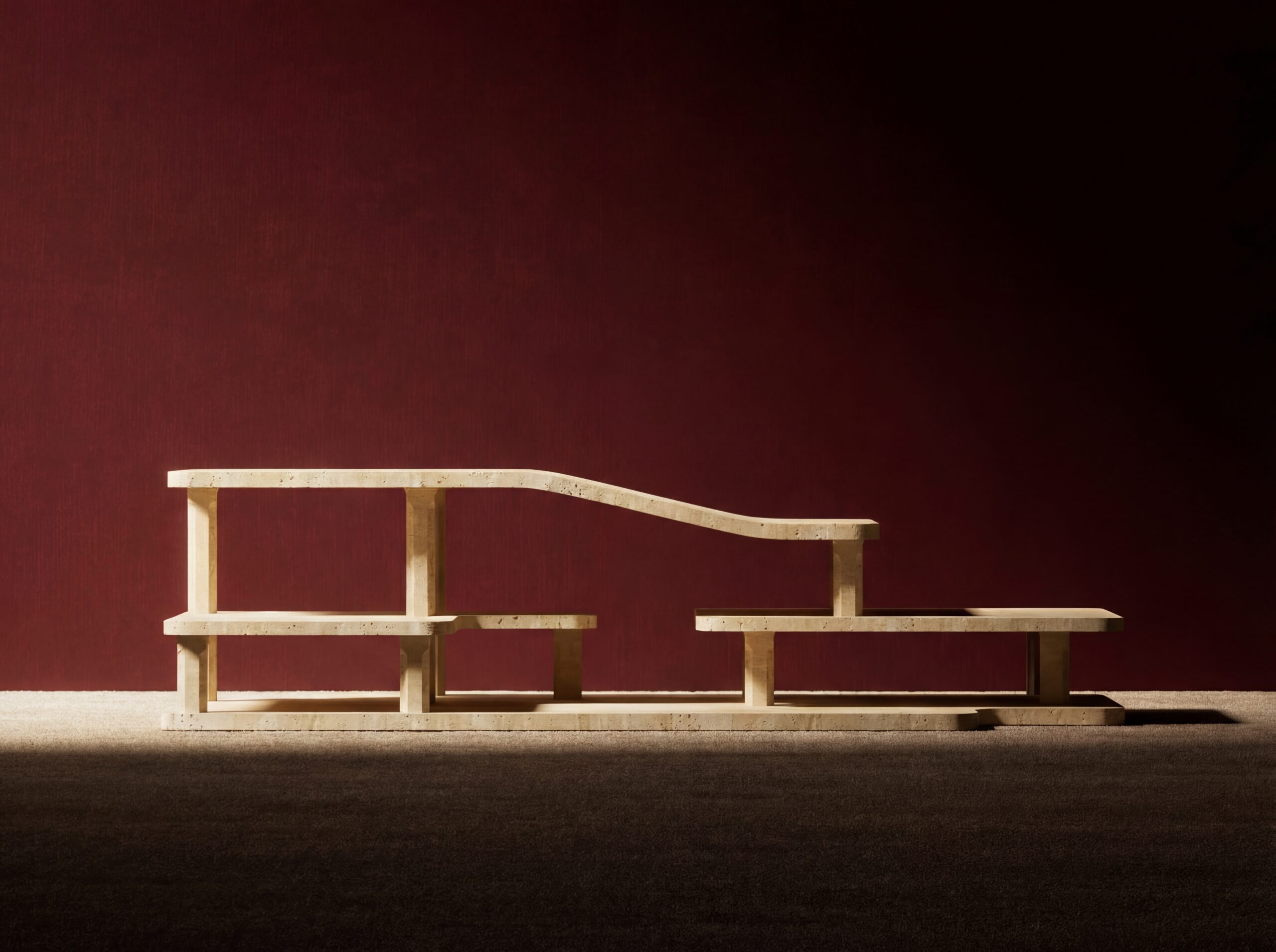 The VILLA center table is a study in architectural landscape and geologic layering. Part of our Collectable Items, it features a series of multi-tiered travertine platforms that appear to drift at varying heights, mimicking the staggered elevations of modernist hillside villas. The composition is anchored by robust octagonal pillars and a continuous base plate, all showcasing the raw, porous beauty of natural stone through clean-lined geometry. This interplay of heavy, monolithic volumes and sweeping horizontal spans gives the VILLA a commanding, sculptural presence that serves as a functional topographic centerpiece for the home.