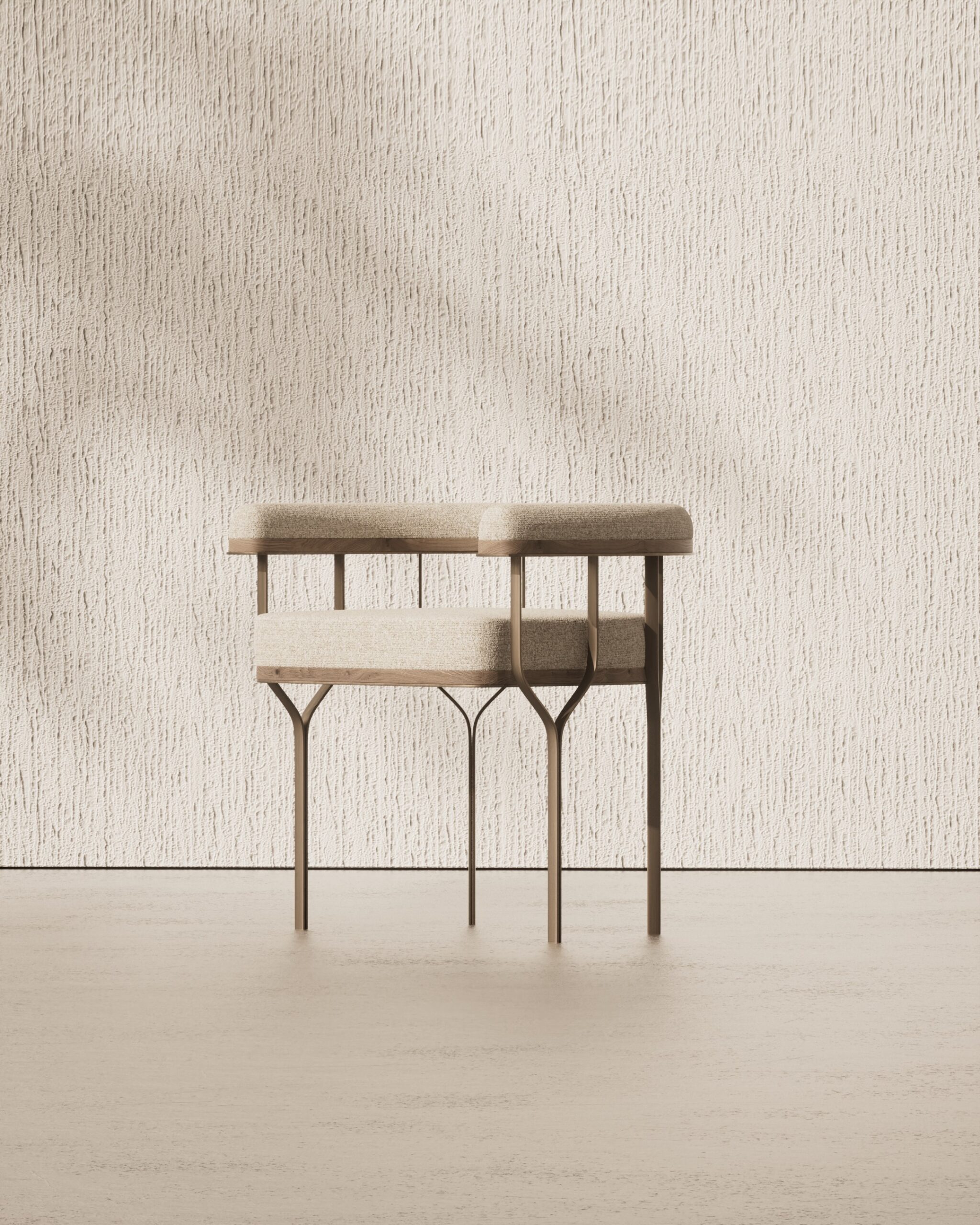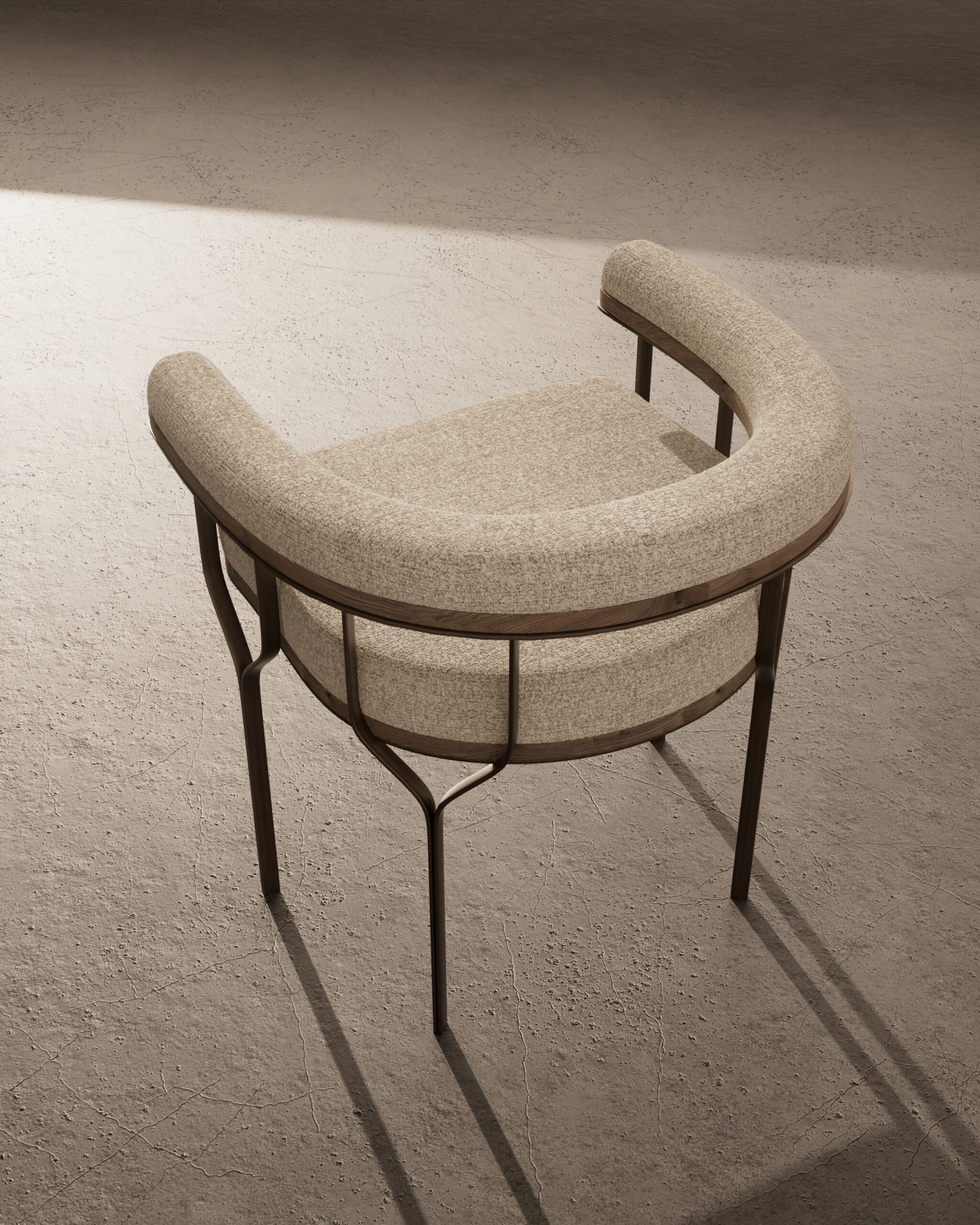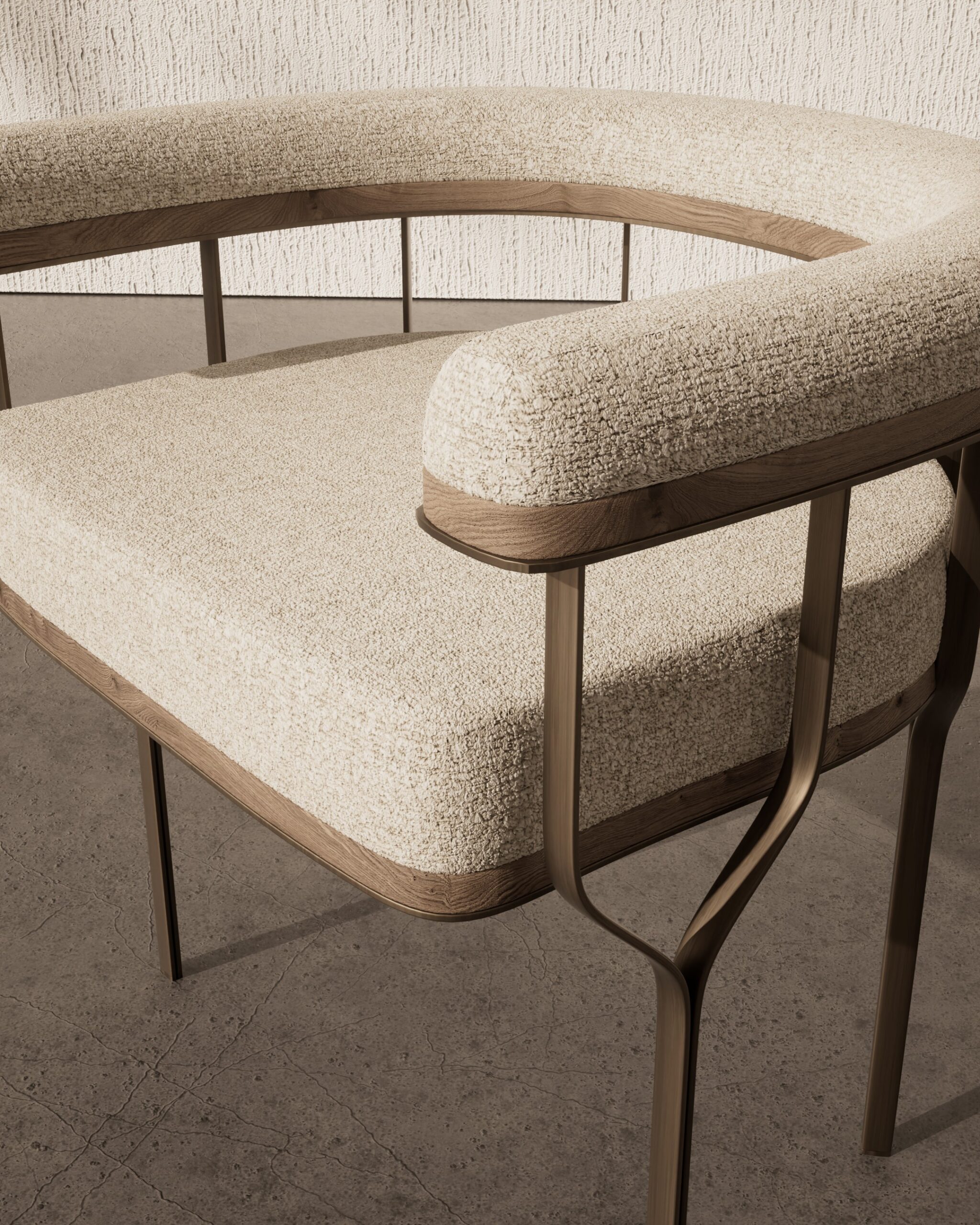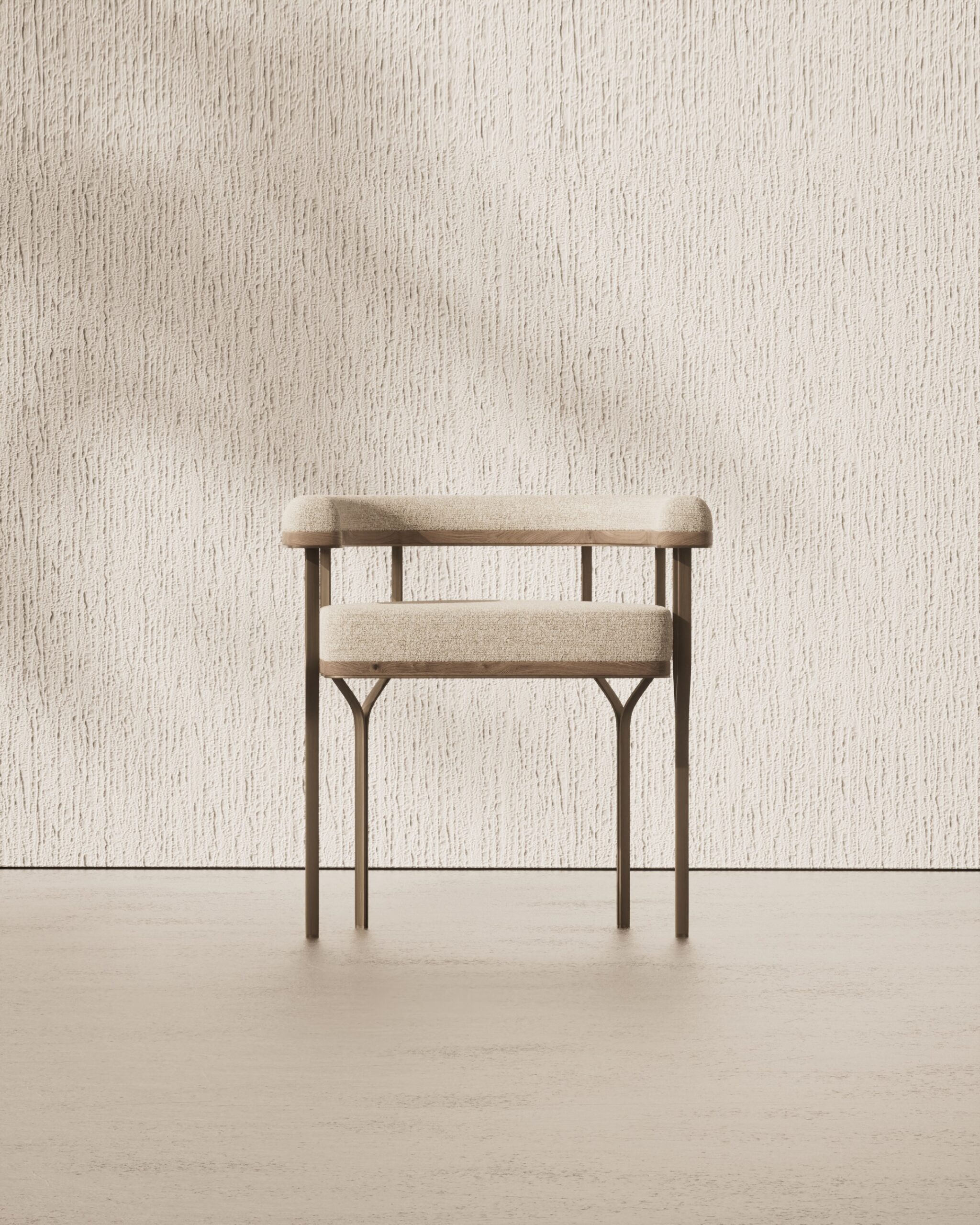 The VIRELLE dining chair is a study in linear transparency and mixed-material warmth. Part of our Design Studio Collection, it features a distinctive cream bouclé backrest that wraps around the sitter, cradled by a continuous natural oak frame. The chair is elevated by a minimalist satin bronze base, characterized by slender, branching legs that provide a light, architectural lift. This interplay between the plush, textured upholstery and the precise geometry of wood and metal creates a sophisticated, airy silhouette for the modern dining room.